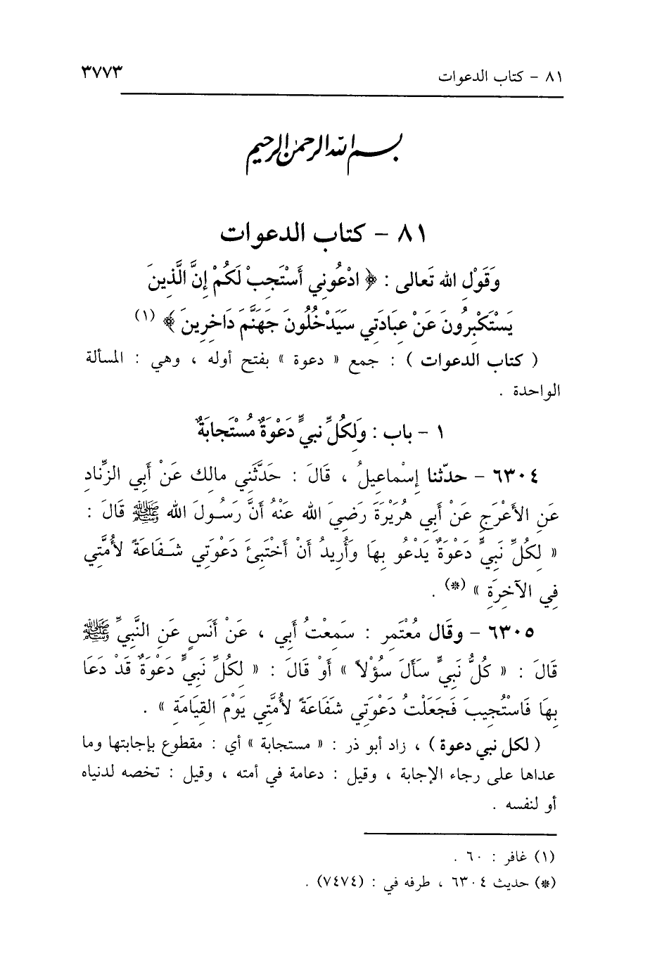 6304 - حَدَّثَنَا إِسْمَاعِيلُ، قَالَ: حَدَّثَنِي مَالِكٌ، عَنْ أَبِي الزِّنَادِ، عَنِ الأَعْرَجِ، عَنْ أَبِي هُرَيْرَةَ، أَنَّ رَسُولَ اللَّهِ صَلَّى اللهُ عَلَيْهِ وَسَلَّمَ قَالَ: «لِكُلِّ نَبِيٍّ دَعْوَةٌ مُسْتَجَابَةٌ يَدْعُو بِهَا، وَأُرِيدُ أَنْ أَخْتَبِئَ دَعْوَتِي شَفَاعَةً لِأُمَّتِي فِي الآخِرَةِ».