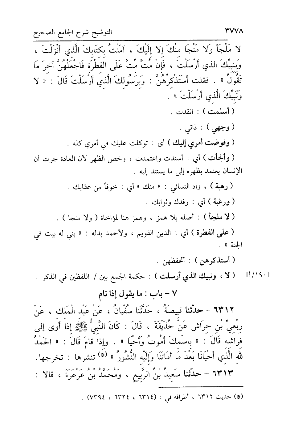 6312 - حَدَّثَنَا قَبِيصَةُ، حَدَّثَنَا سُفْيَانُ، عَنْ عَبْدِ المَلِكِ، عَنْ رِبْعِيِّ بْنِ حِرَاشٍ، عَنْ حُذَيْفَةَ بْنِ اليَمَانِ، قَالَ: كَانَ النَّبِيُّ صَلَّى اللهُ عَلَيْهِ وَسَلَّمَ إِذَا أَوَى إِلَى فِرَاشِهِ، قَالَ: «بِاسْمِكَ أَمُوتُ وَأَحْيَا» وَإِذَا قَامَ قَالَ: «الحَمْدُ لِلَّهِ الَّذِي أَحْيَانَا بَعْدَ مَا أَمَاتَنَا وَإِلَيْهِ النُّشُورُ».