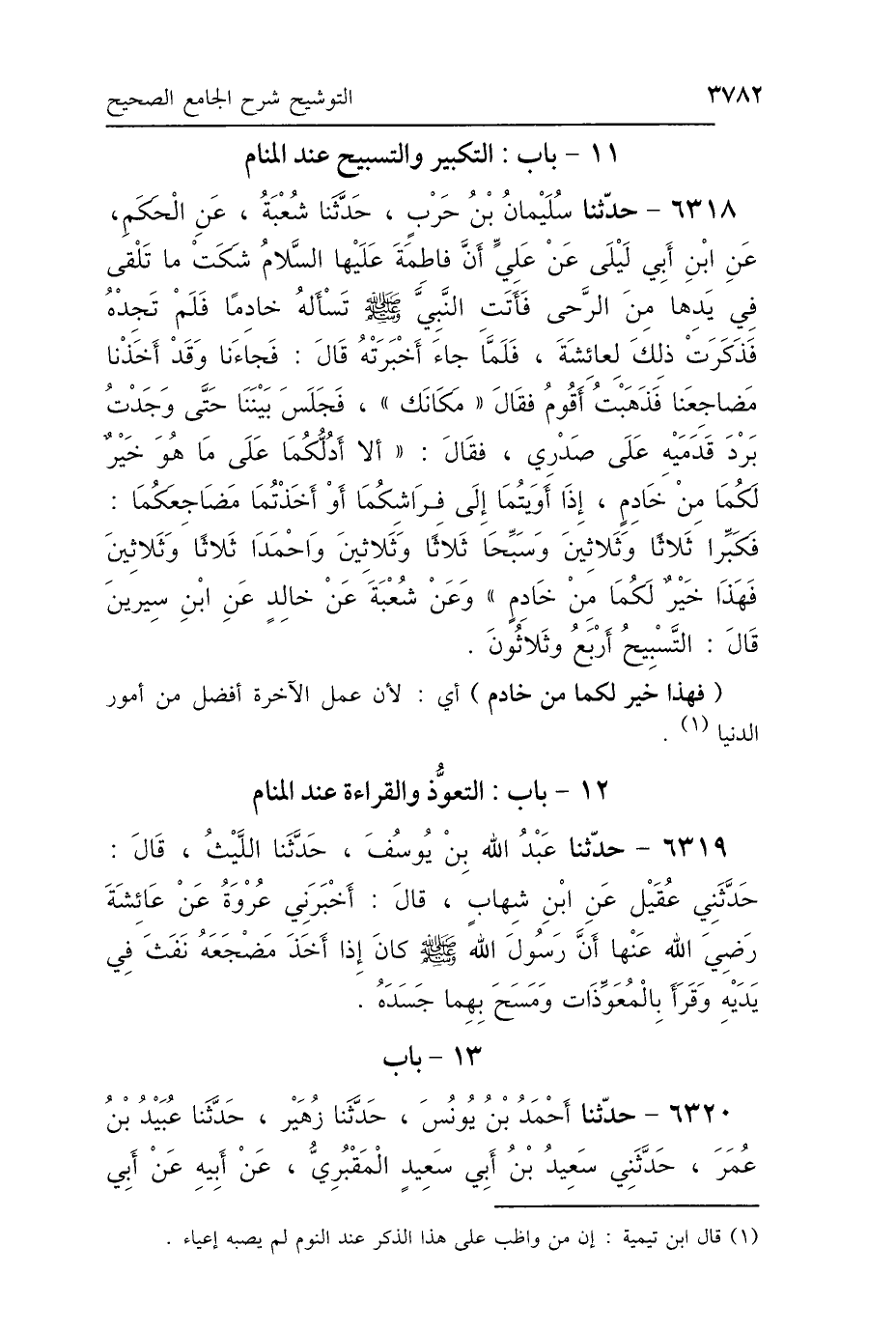 6318 - حَدَّثَنَا سُلَيْمَانُ بْنُ حَرْبٍ، حَدَّثَنَا شُعْبَةُ، عَنِ الحَكَمِ، عَنِ ابْنِ أَبِي لَيْلَى، عَنْ عَلِيٍّ: أَنَّ فَاطِمَةَ عَلَيْهِمَا السَّلاَمُ شَكَتْ مَا تَلْقَى فِي يَدِهَا مِنَ الرَّحَى، فَأَتَتِ النَّبِيَّ صَلَّى اللهُ عَلَيْهِ وَسَلَّمَ تَسْأَلُهُ خَادِمًا فَلَمْ تَجِدْهُ، فَذَكَرَتْ ذَلِكَ لِعَائِشَةَ، فَلَمَّا جَاءَ أَخْبَرَتْهُ، قَالَ: فَجَاءَنَا وَقَدْ أَخَذْنَا مَضَاجِعَنَا، فَذَهَبْتُ أَقُومُ، فَقَالَ: «مَكَانَكِ» فَجَلَسَ بَيْنَنَا حَتَّى وَجَدْتُ بَرْدَ قَدَمَيْهِ عَلَى صَدْرِي، فَقَالَ: «أَلاَ أَدُلُّكُمَا عَلَى مَا هُوَ خَيْرٌ لَكُمَا مِنْ خَادِمٍ؟ إِذَا أَوَيْتُمَا إِلَى فِرَاشِكُمَا، أَوْ أَخَذْتُمَا مَضَاجِعَكُمَا، فَكَبِّرَا ثَلاَثًا وَثَلاَثِينَ، وَسَبِّحَا ثَلاَثًا وَثَلاَثِينَ، وَاحْمَدَا ثَلاَثًا وَثَلاَثِينَ، فَهَذَا خَيْرٌ لَكُمَا مِنْ خَادِمٍ» وَعَنْ شُعْبَةَ، عَنْ خَالِدٍ، عَنْ ابْنِ سِيرِينَ، قَالَ: «التَّسْبِيحُ أَرْبَعٌ وَثَلاَثُونَ».
