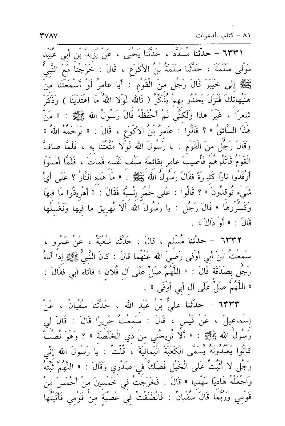 6331 - حَدَّثَنَا مُسَدَّدٌ، حَدَّثَنَا يَحْيَى، عَنْ يَزِيدَ بْنِ أَبِي عُبَيْدٍ مَوْلَى سَلَمَةَ، حَدَّثَنَا سَلَمَةُ بْنُ الأَكْوَعِ، قَالَ: خَرَجْنَا مَعَ النَّبِيِّ صَلَّى اللهُ عَلَيْهِ وَسَلَّمَ إِلَى خَيْبَرَ، قَالَ رَجُلٌ مِنَ القَوْمِ: أَيَا عَامِرُ لَوْ أَسْمَعْتَنَا مِنْ هُنَيْهَاتِكَ، فَنَزَلَ يَحْدُو بِهِمْ يُذَكِّرُ: