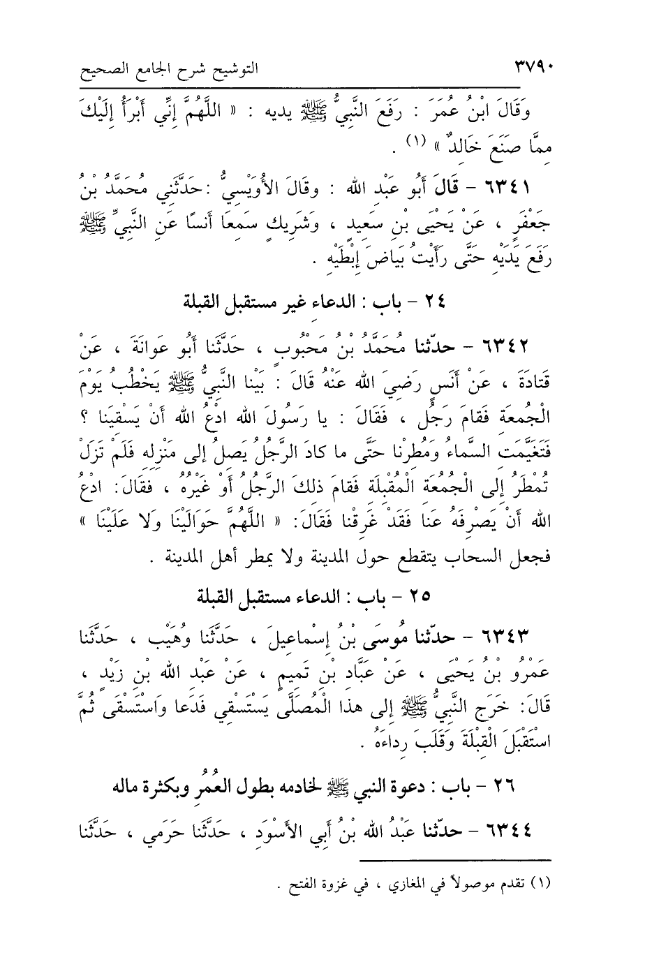 6341 - قَالَ أَبُو عَبْدِ اللَّهِ: وَقَالَ الأُوَيْسِيُّ، حَدَّثَنِي مُحَمَّدُ بْنُ جَعْفَرٍ، عَنْ يَحْيَى بْنِ سَعِيدٍ، وَشَرِيكٍ: سَمِعَا أَنَسًا، عَنِ النَّبِيِّ صَلَّى اللهُ عَلَيْهِ وَسَلَّمَ: «رَفَعَ يَدَيْهِ حَتَّى رَأَيْتُ بَيَاضَ إِبْطَيْهِ».