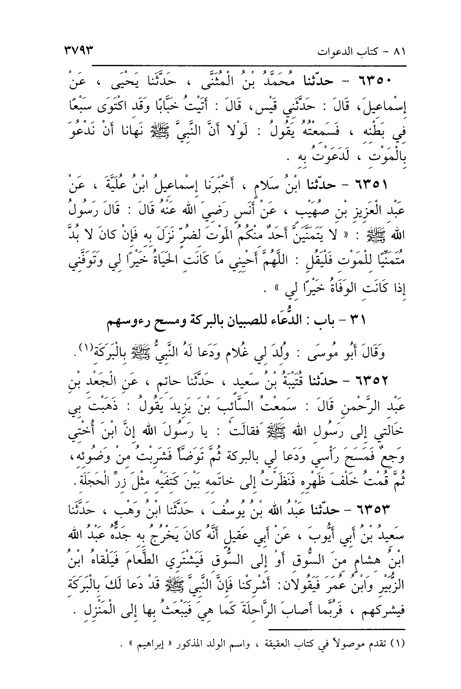 6350 - حَدَّثَنَا مُحَمَّدُ بْنُ المُثَنَّى، حَدَّثَنَا يَحْيَى، عَنْ إِسْمَاعِيلَ، قَالَ: حَدَّثَنِي قَيْسٌ، قَالَ: أَتَيْتُ خَبَّابًا، وَقَدِ اكْتَوَى سَبْعًا فِي بَطْنِهِ، فَسَمِعْتُهُ يَقُولُ: «لَوْلاَ أَنَّ النَّبِيَّ صَلَّى اللهُ عَلَيْهِ وَسَلَّمَ نَهَانَا أَنْ نَدْعُوَ بِالْمَوْتِ لَدَعَوْتُ بِهِ».
