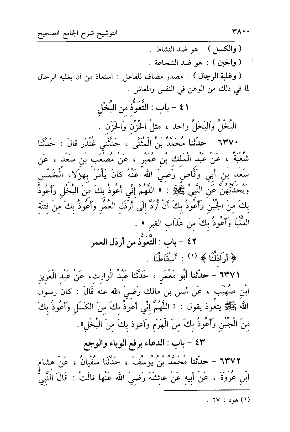 6371 - حَدَّثَنَا أَبُو مَعْمَرٍ، حَدَّثَنَا عَبْدُ الوَارِثِ، عَنْ عَبْدِ العَزِيزِ بْنِ صُهَيْبٍ، عَنْ أَنَسِ بْنِ مَالِكٍ رَضِيَ اللَّهُ عَنْهُ، قَالَ: كَانَ رَسُولُ اللَّهِ صَلَّى اللهُ عَلَيْهِ وَسَلَّمَ يَتَعَوَّذُ يَقُولُ: «اللَّهُمَّ إِنِّي أَعُوذُ بِكَ مِنَ الكَسَلِ، وَأَعُوذُ بِكَ مِنَ الجُبْنِ، وَأَعُوذُ بِكَ مِنَ الهَرَمِ، وَأَعُوذُ بِكَ مِنَ البُخْلِ».