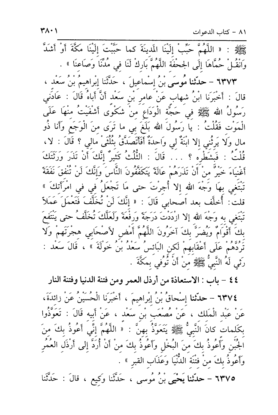 6373 - حَدَّثَنَا مُوسَى بْنُ إِسْمَاعِيلَ، حَدَّثَنَا إِبْرَاهِيمُ بْنُ سَعْدٍ، أَخْبَرَنَا ابْنُ شِهَابٍ، عَنْ عَامِرِ بْنِ سَعْدٍ، أَنَّ أَبَاهُ، قَالَ: عَادَنِي رَسُولُ اللَّهِ صَلَّى اللهُ عَلَيْهِ وَسَلَّمَ فِي حَجَّةِ الوَدَاعِ، مِنْ شَكْوَى أَشْفَيْتُ مِنْهُ عَلَى المَوْتِ، فَقُلْتُ: يَا رَسُولَ اللَّهِ، بَلَغَ بِي مَا تَرَى مِنَ الوَجَعِ، وَأَنَا ذُو مَالٍ، وَلاَ يَرِثُنِي إِلَّا ابْنَةٌ لِي وَاحِدَةٌ، أَفَأَتَصَدَّقُ بِثُلُثَيْ مَالِي؟ قَالَ: «لاَ» قُلْتُ: فَبِشَطْرِهِ؟ قَالَ: «الثُّلُثُ كَثِيرٌ، إِنَّكَ أَنْ تَذَرَ وَرَثَتَكَ أَغْنِيَاءَ خَيْرٌ مِنْ أَنْ تَذَرَهُمْ عَالَةً يَتَكَفَّفُونَ النَّاسَ، وَإِنَّكَ لَنْ تُنْفِقَ نَفَقَةً تَبْتَغِي بِهَا وَجْهَ اللَّهِ إِلَّا أُجِرْتَ، حَتَّى مَا تَجْعَلُ فِي فِي امْرَأَتِكَ» قُلْتُ: أَأُخَلَّفُ بَعْدَ أَصْحَابِي؟ قَالَ: «إِنَّكَ لَنْ تُخَلَّفَ، فَتَعْمَلَ عَمَلًا تَبْتَغِي بِهِ وَجْهَ اللَّهِ، إِلَّا ازْدَدْتَ دَرَجَةً وَرِفْعَةً، وَلَعَلَّكَ تُخَلَّفُ حَتَّى يَنْتَفِعَ بِكَ أَقْوَامٌ وَيُضَرَّ بِكَ آخَرُونَ، اللَّهُمَّ أَمْضِ لِأَصْحَابِي هِجْرَتَهُمْ، وَلاَ تَرُدَّهُمْ عَلَى أَعْقَابِهِمْ، لَكِنِ البَائِسُ سَعْدُ ابْنُ خَوْلَةَ» قَالَ سَعْدٌ: رَثَى لَهُ النَّبِيُّ صَلَّى اللهُ عَلَيْهِ وَسَلَّمَ مِنْ أَنْ تُوُفِّيَ بِمَكَّةَ.