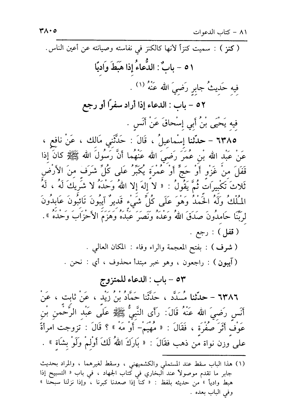 6385 - حَدَّثَنَا إِسْمَاعِيلُ، قَالَ: حَدَّثَنِي مَالِكٌ، عَنْ نَافِعٍ، عَنْ عَبْدِ اللَّهِ بْنِ عُمَرَ رَضِيَ اللَّهُ عَنْهُمَا: أَنَّ رَسُولَ اللَّهِ صَلَّى اللهُ عَلَيْهِ وَسَلَّمَ كَانَ إِذَا قَفَلَ مِنْ غَزْوٍ أَوْ حَجٍّ أَوْ عُمْرَةٍ يُكَبِّرُ عَلَى كُلِّ شَرَفٍ مِنَ الأَرْضِ ثَلاَثَ تَكْبِيرَاتٍ، ثُمَّ يَقُولُ: «لاَ إِلَهَ إِلَّا اللَّهُ، وَحْدَهُ لاَ شَرِيكَ لَهُ، لَهُ المُلْكُ وَلَهُ الحَمْدُ، وَهُوَ عَلَى كُلِّ شَيْءٍ قَدِيرٌ. آيِبُونَ تَائِبُونَ عَابِدُونَ، لِرَبِّنَا حَامِدُونَ. صَدَقَ اللَّهُ وَعْدَهُ، وَنَصَرَ عَبْدَهُ، وَهَزَمَ الأَحْزَابَ وَحْدَهُ».