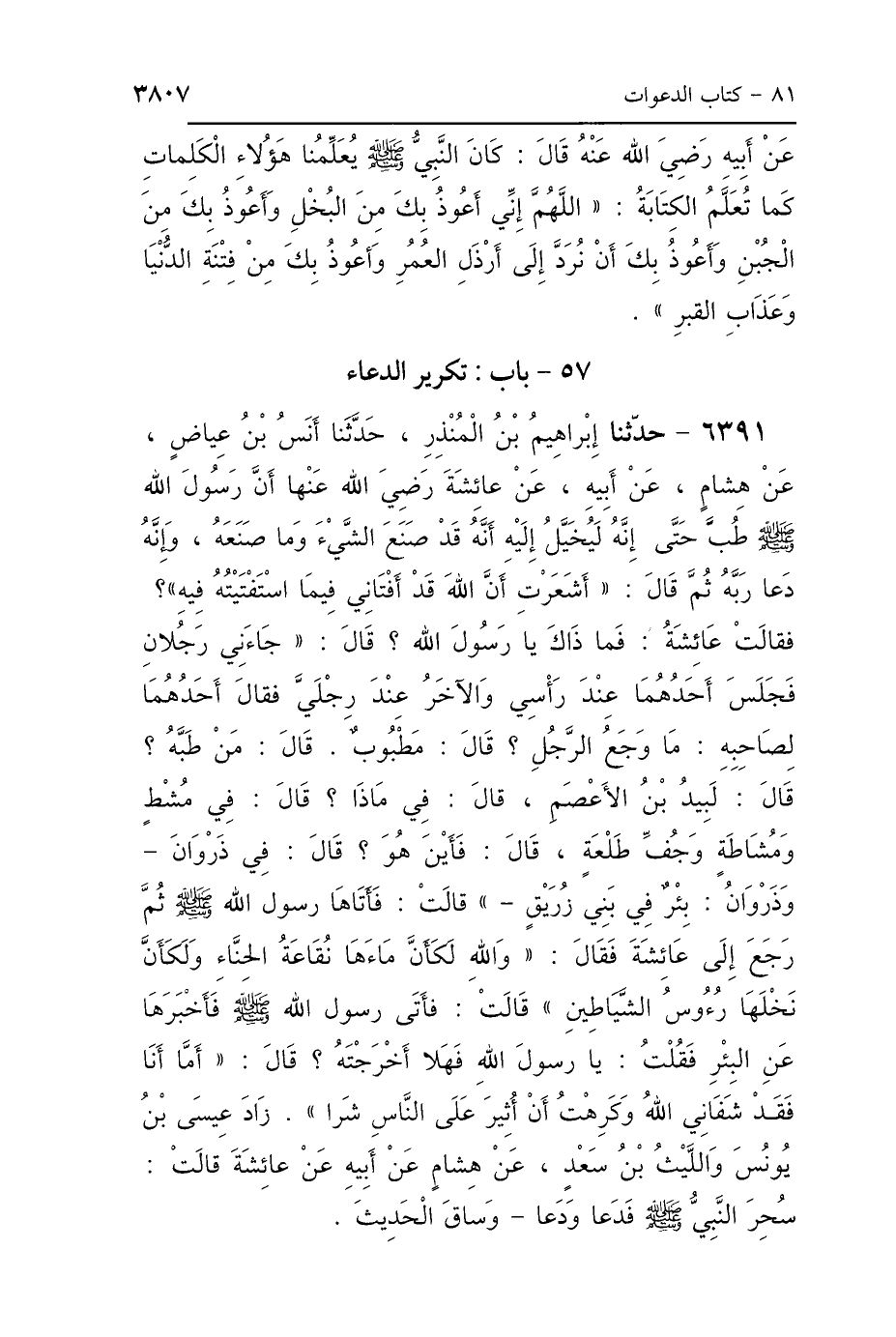 6391 - حَدَّثَنَا إِبْرَاهِيمُ بْنُ مُنْذِرٍ، حَدَّثَنَا أَنَسُ بْنُ عِيَاضٍ، عَنْ هِشَامٍ، عَنْ أَبِيهِ، عَنْ عَائِشَةَ رَضِيَ اللَّهُ عَنْهَا: أَنَّ رَسُولَ اللَّهِ صَلَّى اللهُ عَلَيْهِ وَسَلَّمَ طُبَّ، حَتَّى إِنَّهُ لَيُخَيَّلُ إِلَيْهِ أَنَّهُ قَدْ صَنَعَ الشَّيْءَ وَمَا صَنَعَهُ، وَإِنَّهُ دَعَا رَبَّهُ، ثُمَّ قَالَ: «أَشَعَرْتِ أَنَّ اللَّهَ قَدْ أَفْتَانِي فِيمَا اسْتَفْتَيْتُهُ فِيهِ» فَقَالَتْ عَائِشَةُ: فَمَا ذَاكَ يَا رَسُولَ اللَّهِ؟ قَالَ: " جَاءَنِي رَجُلاَنِ، فَجَلَسَ أَحَدُهُمَا عِنْدَ رَأْسِي، وَالآخَرُ عِنْدَ رِجْلَيَّ، فَقَالَ أَحَدُهُمَا لِصَاحِبِهِ: مَا وَجَعُ الرَّجُلِ؟ قَالَ: مَطْبُوبٌ، قَالَ: مَنْ طَبَّهُ؟ قَالَ: لَبِيدُ بْنُ الأَعْصَمِ، قَالَ: فِي مَاذَا؟ قَالَ: فِي مُشْطٍ وَمُشَاطَةٍ وَجُفِّ طَلْعَةٍ، قَالَ: فَأَيْنَ هُوَ؟ قَالَ: فِي ذَرْوَانَ " - وَذَرْوَانُ بِئْرٌ فِي بَنِي زُرَيْقٍ - قَالَتْ: فَأَتَاهَا رَسُولُ اللَّهِ صَلَّى اللهُ عَلَيْهِ وَسَلَّمَ ثُمَّ رَجَعَ إِلَى عَائِشَةَ، فَقَالَ: «وَاللَّهِ لَكَأَنَّ مَاءَهَا نُقَاعَةُ الحِنَّاءِ، وَلَكَأَنَّ نَخْلَهَا رُءُوسُ الشَّيَاطِينِ» قَالَتْ: فَأَتَى رَسُولُ اللَّهِ صَلَّى اللهُ عَلَيْهِ وَسَلَّمَ فَأَخْبَرَهَا عَنِ البِئْرِ، فَقُلْتُ: يَا رَسُولَ اللَّهِ فَهَلَّا أَخْرَجْتَهُ؟ قَالَ: «أَمَّا أَنَا فَقَدْ شَفَانِي اللَّهُ، وَكَرِهْتُ أَنْ أُثِيرَ عَلَى النَّاسِ شَرًّا» زَادَ عِيسَى بْنُ يُونُسَ، وَاللَّيْثُ بْنُ سَعْدٍ، عَنْ هِشَامٍ، عَنْ أَبِيهِ، عَنْ عَائِشَةَ، قَالَتْ: «سُحِرَ النَّبِيُّ صَلَّى اللهُ عَلَيْهِ وَسَلَّمَ، فَدَعَا وَدَعَا» وَسَاقَ الحَدِيثَ.