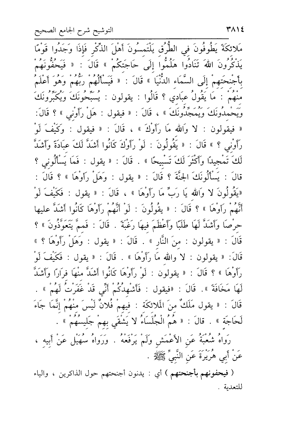 مَلاَئِكَةً يَطُوفُونَ فِي الطُّرُقِ يَلْتَمِسُونَ أَهْلَ الذِّكْرِ، فَإِذَا وَجَدُوا قَوْمًا يَذْكُرُونَ اللَّهَ تَنَادَوْا: هَلُمُّوا إِلَى حَاجَتِكُمْ " قَالَ: «فَيَحُفُّونَهُمْ بِأَجْنِحَتِهِمْ إِلَى السَّمَاءِ الدُّنْيَا» قَالَ: " فَيَسْأَلُهُمْ رَبُّهُمْ، وَهُوَ أَعْلَمُ مِنْهُمْ، مَا يَقُولُ عِبَادِي؟ قَالُوا: يَقُولُونَ: يُسَبِّحُونَكَ وَيُكَبِّرُونَكَ وَيَحْمَدُونَكَ وَيُمَجِّدُونَكَ " قَالَ: " فَيَقُولُ: هَلْ رَأَوْنِي؟ " قَالَ: " فَيَقُولُونَ: لاَ وَاللَّهِ مَا رَأَوْكَ؟ " قَالَ: " فَيَقُولُ: وَكَيْفَ لَوْ رَأَوْنِي؟ " قَالَ: " يَقُولُونَ: لَوْ رَأَوْكَ كَانُوا أَشَدَّ لَكَ عِبَادَةً، وَأَشَدَّ لَكَ تَمْجِيدًا وَتَحْمِيدًا، وَأَكْثَرَ لَكَ تَسْبِيحًا " قَالَ: " يَقُولُ: فَمَا يَسْأَلُونِي؟ " قَالَ: «يَسْأَلُونَكَ الجَنَّةَ» قَالَ: " يَقُولُ: وَهَلْ رَأَوْهَا؟ " قَالَ: " يَقُولُونَ: لاَ وَاللَّهِ يَا رَبِّ مَا رَأَوْهَا " قَالَ: " يَقُولُ: فَكَيْفَ لَوْ أَنَّهُمْ رَأَوْهَا؟ " قَالَ: " يَقُولُونَ: لَوْ أَنَّهُمْ رَأَوْهَا كَانُوا أَشَدَّ عَلَيْهَا حِرْصًا، وَأَشَدَّ لَهَا طَلَبًا، وَأَعْظَمَ فِيهَا رَغْبَةً، قَالَ: فَمِمَّ يَتَعَوَّذُونَ؟ " قَالَ: " يَقُولُونَ: مِنَ النَّارِ " قَالَ: " يَقُولُ: وَهَلْ رَأَوْهَا؟ " قَالَ: " يَقُولُونَ: لاَ وَاللَّهِ يَا رَبِّ مَا رَأَوْهَا " قَالَ: " يَقُولُ: فَكَيْفَ لَوْ رَأَوْهَا؟ " قَالَ: " يَقُولُونَ: لَوْ رَأَوْهَا كَانُوا أَشَدَّ مِنْهَا فِرَارًا، وَأَشَدَّ لَهَا مَخَافَةً " قَالَ: " فَيَقُولُ: فَأُشْهِدُكُمْ أَنِّي قَدْ غَفَرْتُ لَهُمْ " قَالَ: " يَقُولُ مَلَكٌ مِنَ المَلاَئِكَةِ: فِيهِمْ فُلاَنٌ لَيْسَ مِنْهُمْ، إِنَّمَا جَاءَ لِحَاجَةٍ. قَالَ: هُمُ الجُلَسَاءُ لاَ يَشْقَى بِهِمْ جَلِيسُهُمْ " رَوَاهُ شُعْبَةُ، عَنِ الأَعْمَشِ، وَلَمْ يَرْفَعْهُ، وَرَوَاهُ سُهَيْلٌ، عَنْ أَبِيهِ، عَنْ أَبِي هُرَيْرَةَ، عَنِ النَّبِيِّ صَلَّى اللهُ عَلَيْهِ وَسَلَّمَ.