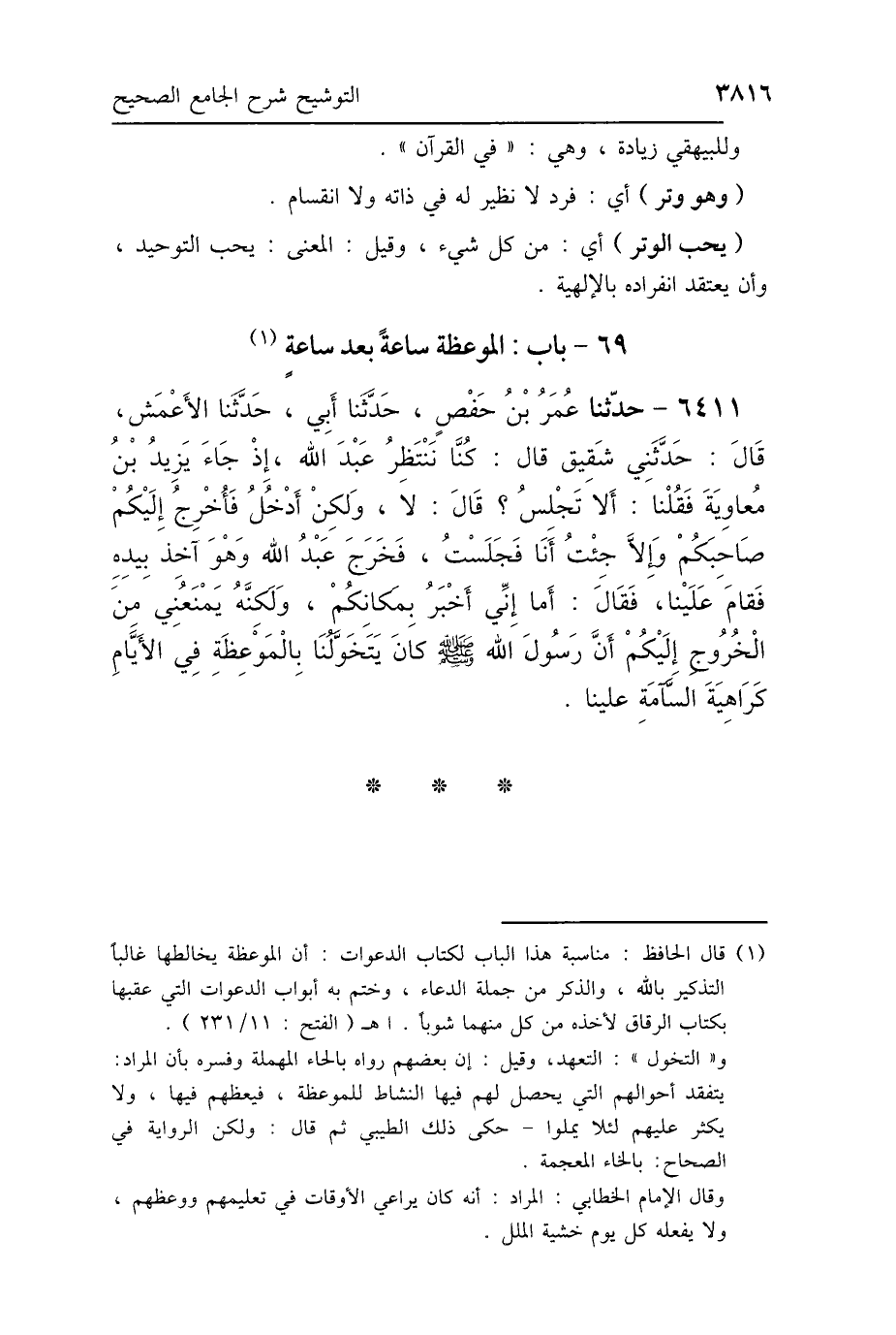 6411 - حَدَّثَنَا عُمَرُ بْنُ حَفْصٍ، حَدَّثَنَا أَبِي، حَدَّثَنَا الأَعْمَشُ، قَالَ: حَدَّثَنِي شَقِيقٌ، قَالَ: كُنَّا نَنْتَظِرُ عَبْدَ اللَّهِ، إِذْ جَاءَ يَزِيدُ بْنُ مُعَاوِيَةَ، فَقُلْنَا: أَلاَ تَجْلِسُ؟ قَالَ: لاَ، وَلَكِنْ أَدْخُلُ فَأُخْرِجُ إِلَيْكُمْ صَاحِبَكُمْ وَإِلَّا جِئْتُ أَنَا فَجَلَسْتُ، فَخَرَجَ عَبْدُ اللَّهِ وَهُوَ آخِذٌ بِيَدِهِ، فَقَامَ عَلَيْنَا فَقَالَ: أَمَا إِنِّي أُخْبَرُ بِمَكَانِكُمْ، وَلَكِنَّهُ يَمْنَعُنِي مِنَ الخُرُوجِ إِلَيْكُمْ: «أَنَّ رَسُولَ اللَّهِ صَلَّى اللهُ عَلَيْهِ وَسَلَّمَ، كَانَ يَتَخَوَّلُنَا بِالْمَوْعِظَةِ فِي الأَيَّامِ، كَرَاهِيَةَ السَّآمَةِ عَلَيْنَا».