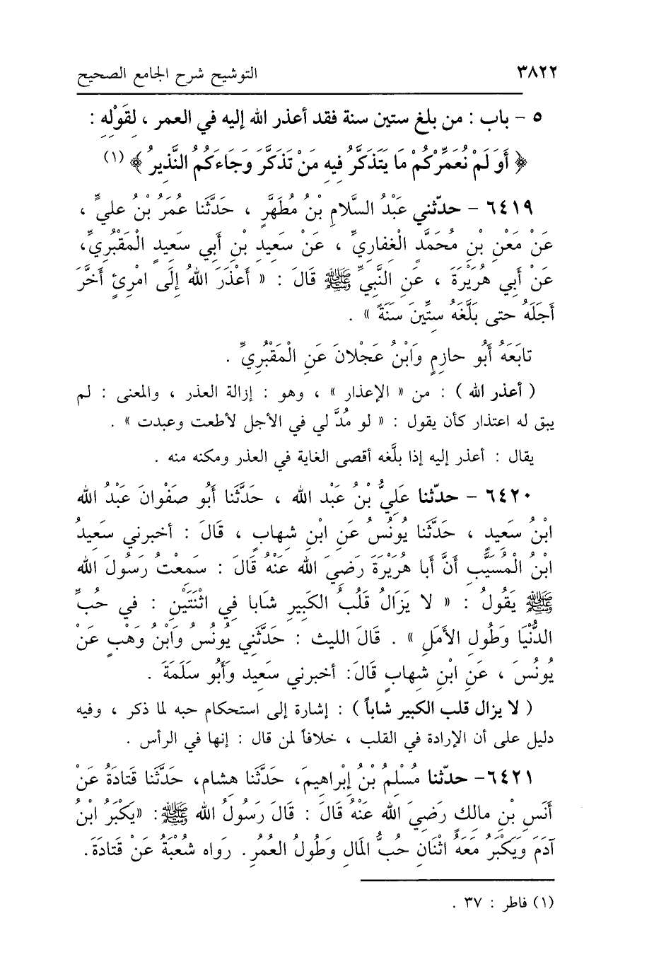 6419 - حَدَّثَنِي عَبْدُ السَّلاَمِ بْنُ مُطَهَّرٍ، حَدَّثَنَا عُمَرُ بْنُ عَلِيٍّ، عَنْ مَعْنِ بْنِ مُحَمَّدٍ الغِفَارِيِّ، عَنْ سَعِيدِ بْنِ أَبِي سَعِيدٍ المَقْبُرِيِّ، عَنْ أَبِي هُرَيْرَةَ، عَنِ النَّبِيِّ صَلَّى اللهُ عَلَيْهِ وَسَلَّمَ قَالَ: «أَعْذَرَ اللَّهُ إِلَى امْرِئٍ أَخَّرَ أَجَلَهُ، حَتَّى بَلَّغَهُ سِتِّينَ سَنَةً» تَابَعَهُ أَبُو حَازِمٍ، وَابْنُ عَجْلاَنَ، عَنِ المَقْبُرِيِّ.