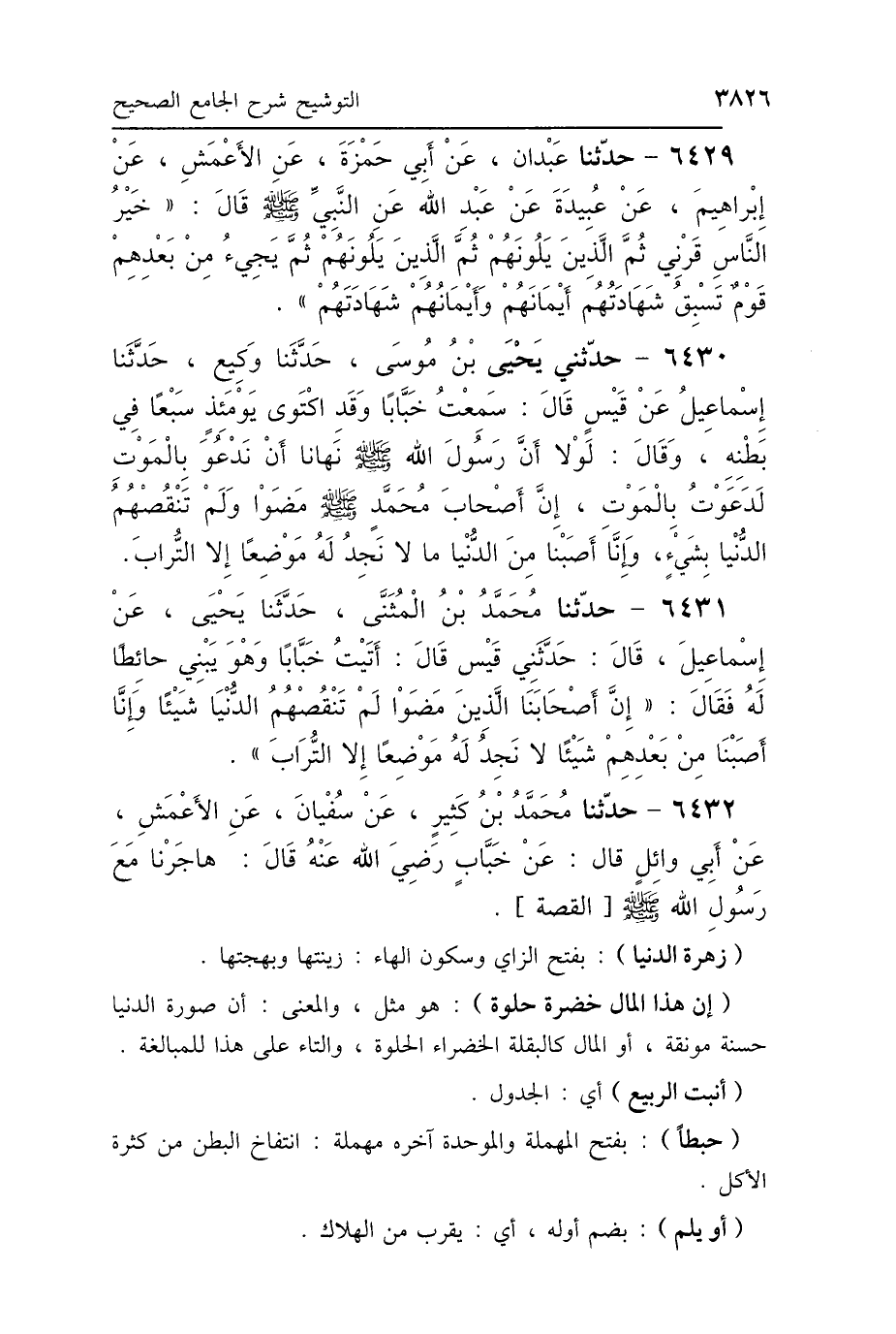 6432 - حَدَّثَنَا مُحَمَّدُ بْنُ كَثِيرٍ، عَنْ سُفْيَانَ، عَنِ الأَعْمَشِ، عَنْ أَبِي وَائِلٍ، عَنْ خَبَّابٍ رَضِيَ اللَّهُ عَنْهُ، قَالَ: «هَاجَرْنَا مَعَ رَسُولِ اللَّهِ صَلَّى اللهُ عَلَيْهِ وَسَلَّمَ» قَصَّهُ.