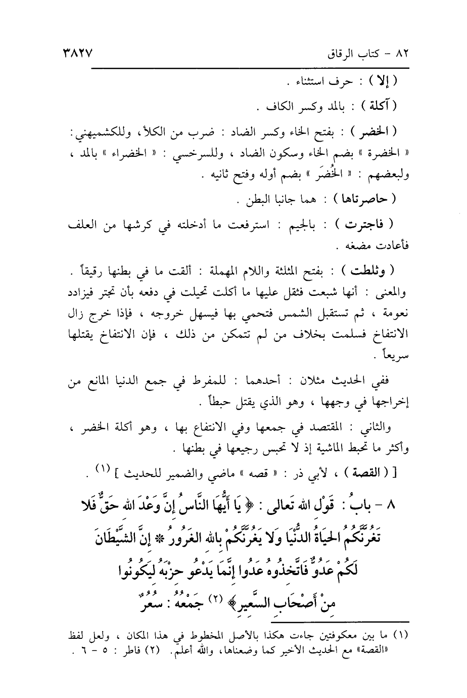 (الخضر): بفتح الخاء وكسر الضاد: ضرب من الكلأ، وللكشميهني: "الخضرة" بضم الخاء وسكون الضاد، وللسرخسي: "الخضراء" بالمد، ولبعضهم: "الخُضَر" بضم أوله وفتح ثانيه.