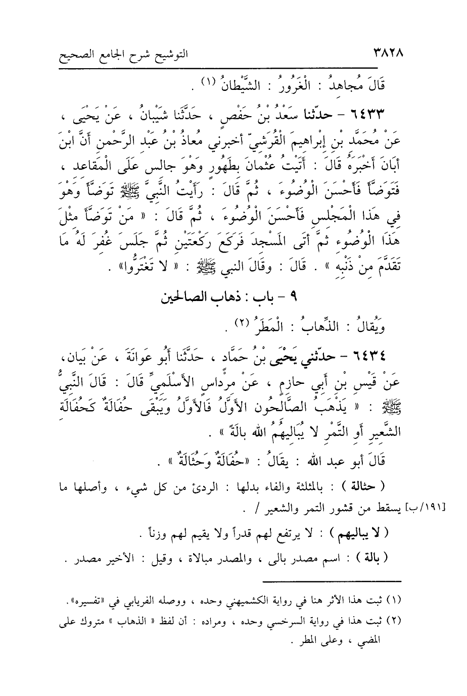 6433 - حَدَّثَنَا سَعْدُ بْنُ حَفْصٍ، حَدَّثَنَا شَيْبَانُ، عَنْ يَحْيَى، عَنْ مُحَمَّدِ بْنِ إِبْرَاهِيمَ القُرَشِيِّ، قَالَ: أَخْبَرَنِي مُعَاذُ بْنُ عَبْدِ الرَّحْمَنِ، أَنَّ حُمْرَانَ بْنَ أَبَانَ، أَخْبَرَهُ قَالَ: أَتَيْتُ عُثْمَانَ بْنَ عَفَّانَ، بِطَهُورٍ وَهُوَ جَالِسٌ عَلَى المَقَاعِدِ، فَتَوَضَّأَ فَأَحْسَنَ الوُضُوءَ، ثُمَّ قَالَ: رَأَيْتُ النَّبِيَّ صَلَّى اللهُ عَلَيْهِ وَسَلَّمَ تَوَضَّأَ وَهُوَ فِي هَذَا المَجْلِسِ، فَأَحْسَنَ الوُضُوءَ ثُمَّ قَالَ: «مَنْ تَوَضَّأَ مِثْلَ هَذَا الوُضُوءِ، ثُمَّ أَتَى المَسْجِدَ فَرَكَعَ رَكْعَتَيْنِ، ثُمَّ جَلَسَ، غُفِرَ لَهُ مَا تَقَدَّمَ مِنْ ذَنْبِهِ» قَالَ: وَقَالَ النَّبِيُّ صَلَّى اللهُ عَلَيْهِ وَسَلَّمَ: «لاَ تَغْتَرُّوا».