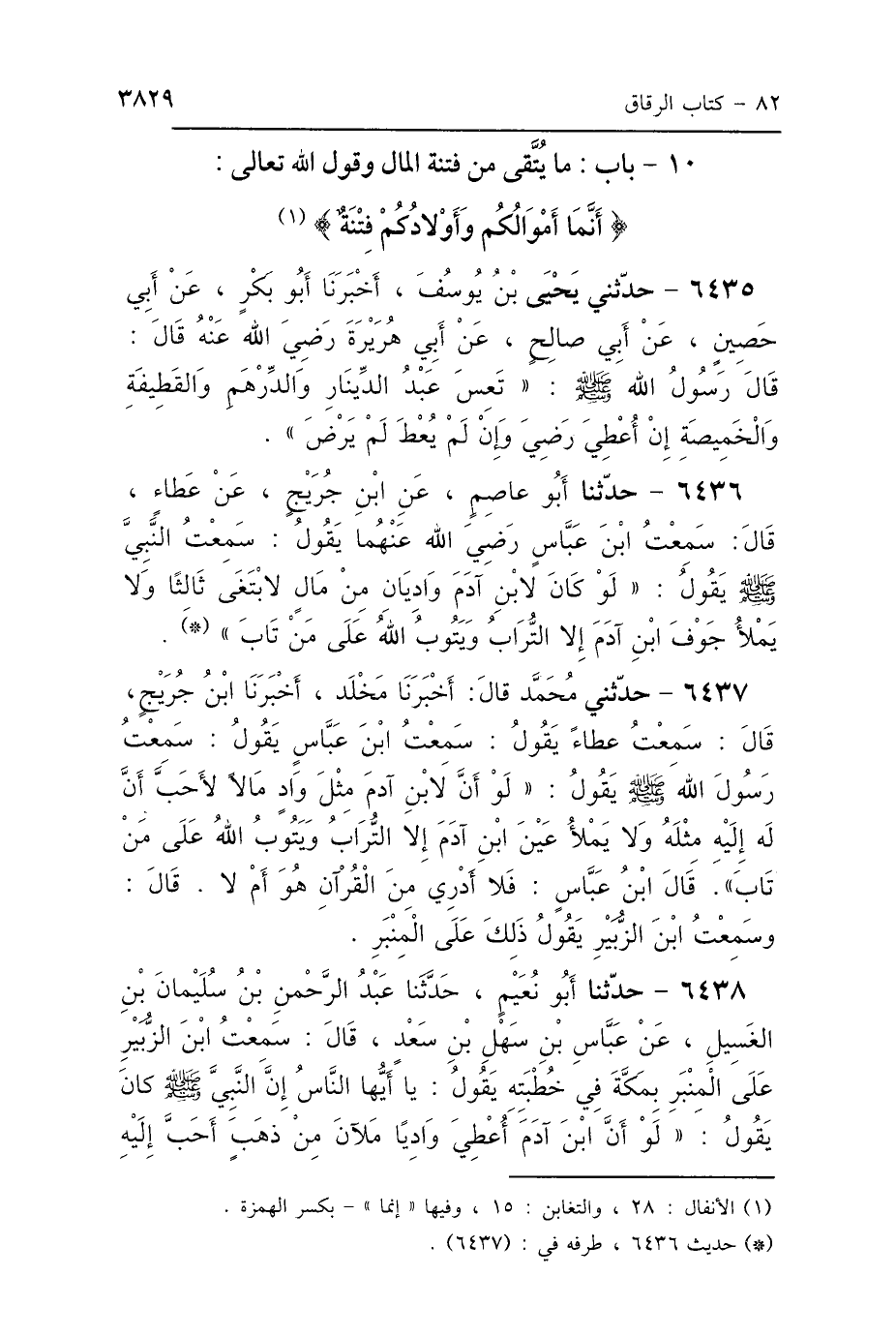6437 - حَدَّثَنِي مُحَمَّدٌ، أَخْبَرَنَا مَخْلَدٌ، أَخْبَرَنَا ابْنُ جُرَيْجٍ، قَالَ: سَمِعْتُ عَطَاءً، يَقُولُ: سَمِعْتُ ابْنَ عَبَّاسٍ، يَقُولُ: سَمِعْتُ رَسُولَ اللَّهِ صَلَّى اللهُ عَلَيْهِ وَسَلَّمَ يَقُولُ: «لَوْ أَنَّ لِابْنِ آدَمَ مِثْلَ وَادٍ مَالًا لَأَحَبَّ أَنَّ لَهُ إِلَيْهِ مِثْلَهُ، وَلاَ يَمْلَأُ عَيْنَ ابْنِ آدَمَ إِلَّا التُّرَابُ، وَيَتُوبُ اللَّهُ عَلَى مَنْ تَابَ» قَالَ ابْنُ عَبَّاسٍ: «فَلاَ أَدْرِي مِنَ القُرْآنِ هُوَ أَمْ لاَ»، قَالَ: وَسَمِعْتُ ابْنَ الزُّبَيْرِ، يَقُولُ ذَلِكَ عَلَى المِنْبَرِ.
