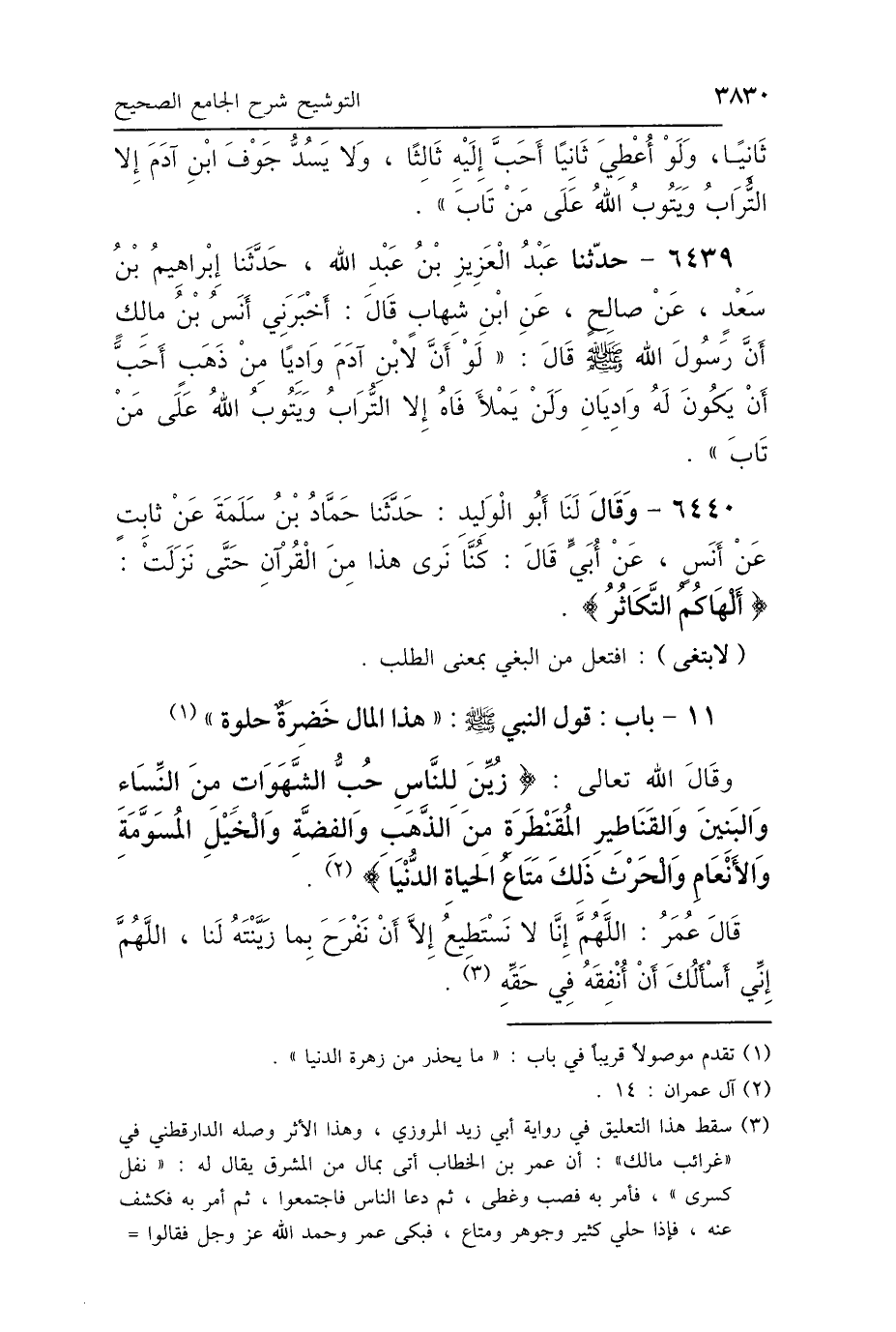 6439 - حَدَّثَنَا عَبْدُ العَزِيزِ بْنُ عَبْدِ اللَّهِ، حَدَّثَنَا إِبْرَاهِيمُ بْنُ سَعْدٍ، عَنْ صَالِحٍ، عَنِ ابْنِ شِهَابٍ، قَالَ: أَخْبَرَنِي أَنَسُ بْنُ مَالِكٍ، أَنَّ رَسُولَ اللَّهِ صَلَّى اللهُ عَلَيْهِ وَسَلَّمَ قَالَ: «لَوْ أَنَّ لِابْنِ آدَمَ وَادِيًا مِنْ ذَهَبٍ أَحَبَّ أَنْ يَكُونَ لَهُ وَادِيَانِ، وَلَنْ يَمْلَأَ فَاهُ إِلَّا التُّرَابُ، وَيَتُوبُ اللَّهُ عَلَى مَنْ تَابَ».