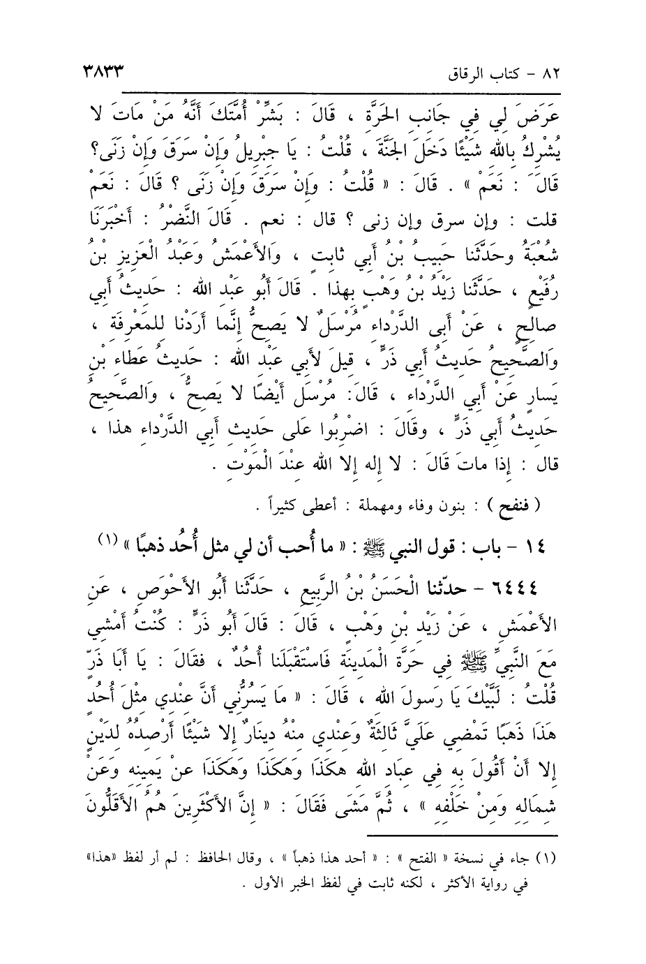 6444 - حَدَّثَنَا الحَسَنُ بْنُ الرَّبِيعِ، حَدَّثَنَا أَبُو الأَحْوَصِ، عَنِ الأَعْمَشِ، عَنْ زَيْدِ بْنِ وَهْبٍ، قَالَ: قَالَ أَبُو ذَرٍّ: كُنْتُ أَمْشِي مَعَ النَّبِيِّ صَلَّى اللهُ عَلَيْهِ وَسَلَّمَ فِي حَرَّةِ المَدِينَةِ، فَاسْتَقْبَلَنَا أُحُدٌ، فَقَالَ: «يَا أَبَا ذَرٍّ» قُلْتُ: لَبَّيْكَ يَا رَسُولَ اللَّهِ، قَالَ: «مَا يَسُرُّنِي أَنَّ عِنْدِي مِثْلَ أُحُدٍ هَذَا ذَهَبًا، تَمْضِي عَلَيَّ ثَالِثَةٌ وَعِنْدِي مِنْهُ دِينَارٌ، إِلَّا شَيْئًا أَرْصُدُهُ لِدَيْنٍ، إِلَّا أَنْ أَقُولَ بِهِ فِي عِبَادِ اللَّهِ هَكَذَا وَهَكَذَا وَهَكَذَا» عَنْ يَمِينِهِ، وَعَنْ شِمَالِهِ، وَمِنْ خَلْفِهِ، ثُمَّ مَشَى فَقَالَ: «إِنَّ الأَكْثَرِينَ هُمُ الأَقَلُّونَ