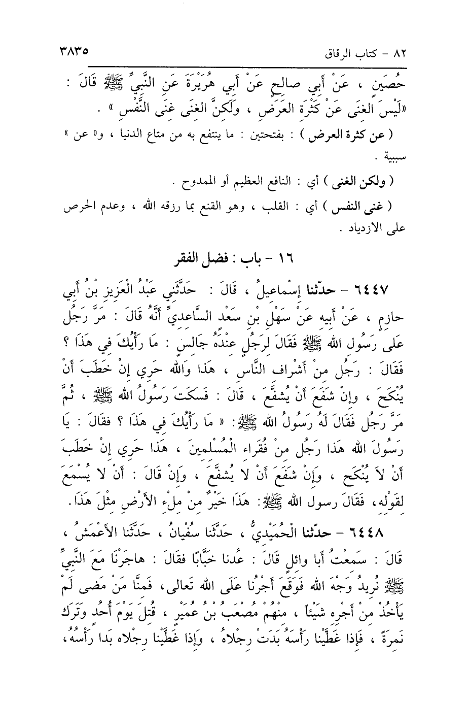 حَصِينٍ، عَنْ أَبِي صَالِحٍ، عَنْ أَبِي هُرَيْرَةَ، عَنِ النَّبِيِّ صَلَّى اللهُ عَلَيْهِ وَسَلَّمَ قَالَ: «لَيْسَ الغِنَى عَنْ كَثْرَةِ العَرَضِ، وَلَكِنَّ الغِنَى غِنَى النَّفْسِ».