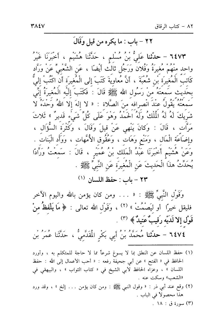 6473 - حَدَّثَنَا عَلِيُّ بْنُ مُسْلِمٍ، حَدَّثَنَا هُشَيْمٌ، أَخْبَرَنَا غَيْرُ وَاحِدٍ مِنْهُمْ: مُغِيرَةُ، وَفُلاَنٌ وَرَجُلٌ ثَالِثٌ أَيْضًا، عَنِ الشَّعْبِيِّ، عَنْ وَرَّادٍ كَاتِبِ المُغِيرَةِ بْنِ شُعْبَةَ: أَنَّ مُعَاوِيَةَ كَتَبَ إِلَى المُغِيرَةِ: أَنِ اكْتُبْ إِلَيَّ بِحَدِيثٍ سَمِعْتَهُ مِنْ رَسُولِ اللَّهِ صَلَّى اللهُ عَلَيْهِ وَسَلَّمَ، قَالَ: فَكَتَبَ إِلَيْهِ المُغِيرَةُ: إِنِّي سَمِعْتُهُ يَقُولُ عِنْدَ انْصِرَافِهِ مِنَ الصَّلاَةِ: «لاَ إِلَهَ إِلَّا اللَّهُ وَحْدَهُ لاَ شَرِيكَ لَهُ، لَهُ المُلْكُ وَلَهُ الحَمْدُ، وَهُوَ عَلَى كُلِّ شَيْءٍ قَدِيرٌ» ثَلاَثَ مَرَّاتٍ، قَالَ: وَكَانَ يَنْهَى عَنْ قِيلَ وَقَالَ، وَكَثْرَةِ السُّؤَالِ، وَإِضَاعَةِ المَالِ، وَمَنْعٍ وَهَاتِ، وَعُقُوقِ الأُمَّهَاتِ، وَوَأْدِ البَنَاتِ وَعَنْ هُشَيْمٍ، أَخْبَرَنَا عَبْدُ المَلِكِ بْنُ عُمَيْرٍ، قَالَ: سَمِعْتُ وَرَّادًا، يُحَدِّثُ هَذَا الحَدِيثَ، عَنِ المُغِيرَةِ، عَنِ النَّبِيِّ صَلَّى اللهُ عَلَيْهِ وَسَلَّمَ.