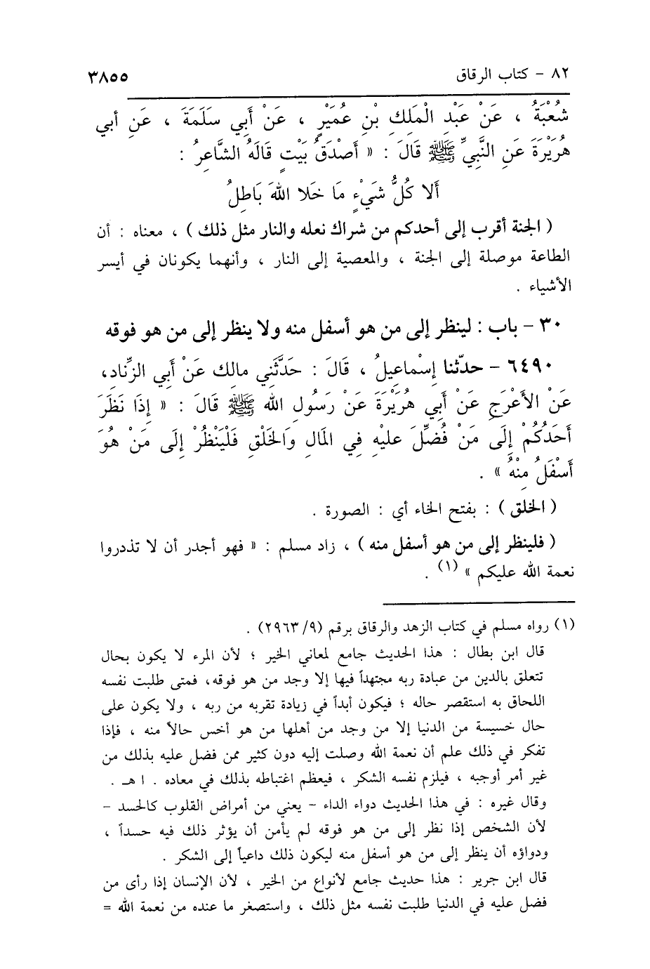 30 - بَابٌ: لِيَنْظُرْ إِلَى مَنْ هُوَ أَسْفَلَ مِنْهُ، وَلاَ يَنْظُرْ إِلَى مَنْ هُوَ فَوْقَهُ
