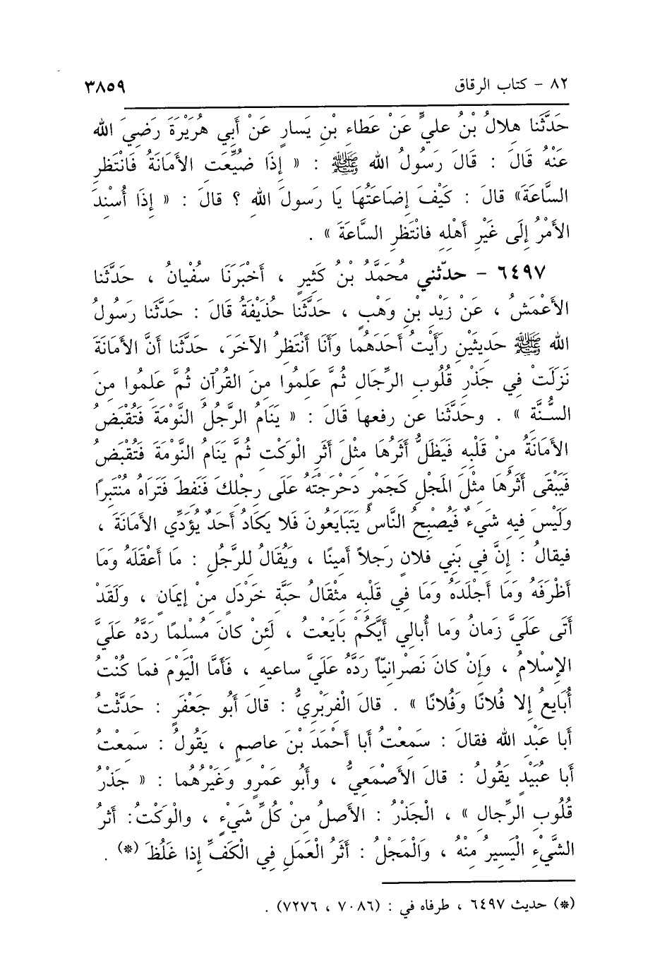 6497 - حَدَّثَنَا مُحَمَّدُ بْنُ كَثِيرٍ، أَخْبَرَنَا سُفْيَانُ، حَدَّثَنَا الأَعْمَشُ، عَنْ زَيْدِ بْنِ وَهْبٍ، حَدَّثَنَا حُذَيْفَةُ، قَالَ: حَدَّثَنَا رَسُولُ اللَّهِ صَلَّى اللهُ عَلَيْهِ وَسَلَّمَ حَدِيثَيْنِ، رَأَيْتُ أَحَدَهُمَا وَأَنَا أَنْتَظِرُ الآخَرَ: حَدَّثَنَا: «أَنَّ الأَمَانَةَ نَزَلَتْ فِي جَذْرِ قُلُوبِ الرِّجَالِ، ثُمَّ عَلِمُوا مِنَ القُرْآنِ، ثُمَّ عَلِمُوا مِنَ السُّنَّةِ» وَحَدَّثَنَا عَنْ رَفْعِهَا قَالَ: " يَنَامُ الرَّجُلُ النَّوْمَةَ، فَتُقْبَضُ الأَمَانَةُ مِنْ قَلْبِهِ، فَيَظَلُّ أَثَرُهَا مِثْلَ أَثَرِ الوَكْتِ، ثُمَّ يَنَامُ النَّوْمَةَ فَتُقْبَضُ فَيَبْقَى أَثَرُهَا مِثْلَ المَجْلِ، كَجَمْرٍ دَحْرَجْتَهُ عَلَى رِجْلِكَ فَنَفِطَ، فَتَرَاهُ مُنْتَبِرًا وَلَيْسَ فِيهِ شَيْءٌ، فَيُصْبِحُ النَّاسُ يَتَبَايَعُونَ، فَلاَ يَكَادُ أَحَدٌ يُؤَدِّي الأَمَانَةَ، فَيُقَالُ: إِنَّ فِي بَنِي فُلاَنٍ رَجُلًا أَمِينًا، وَيُقَالُ لِلرَّجُلِ: مَا أَعْقَلَهُ وَمَا أَظْرَفَهُ وَمَا أَجْلَدَهُ، وَمَا فِي قَلْبِهِ مِثْقَالُ حَبَّةِ خَرْدَلٍ مِنْ إِيمَانٍ " وَلَقَدْ أَتَى عَلَيَّ زَمَانٌ وَمَا أُبَالِي أَيَّكُمْ بَايَعْتُ، لَئِنْ كَانَ مُسْلِمًا رَدَّهُ عَلَيَّ الإِسْلاَمُ، وَإِنْ كَانَ نَصْرَانِيًّا رَدَّهُ عَلَيَّ سَاعِيهِ، فَأَمَّا اليَوْمَ: فَمَا كُنْتُ أُبَايِعُ إِلَّا فُلاَنًا وَفُلاَنًا.