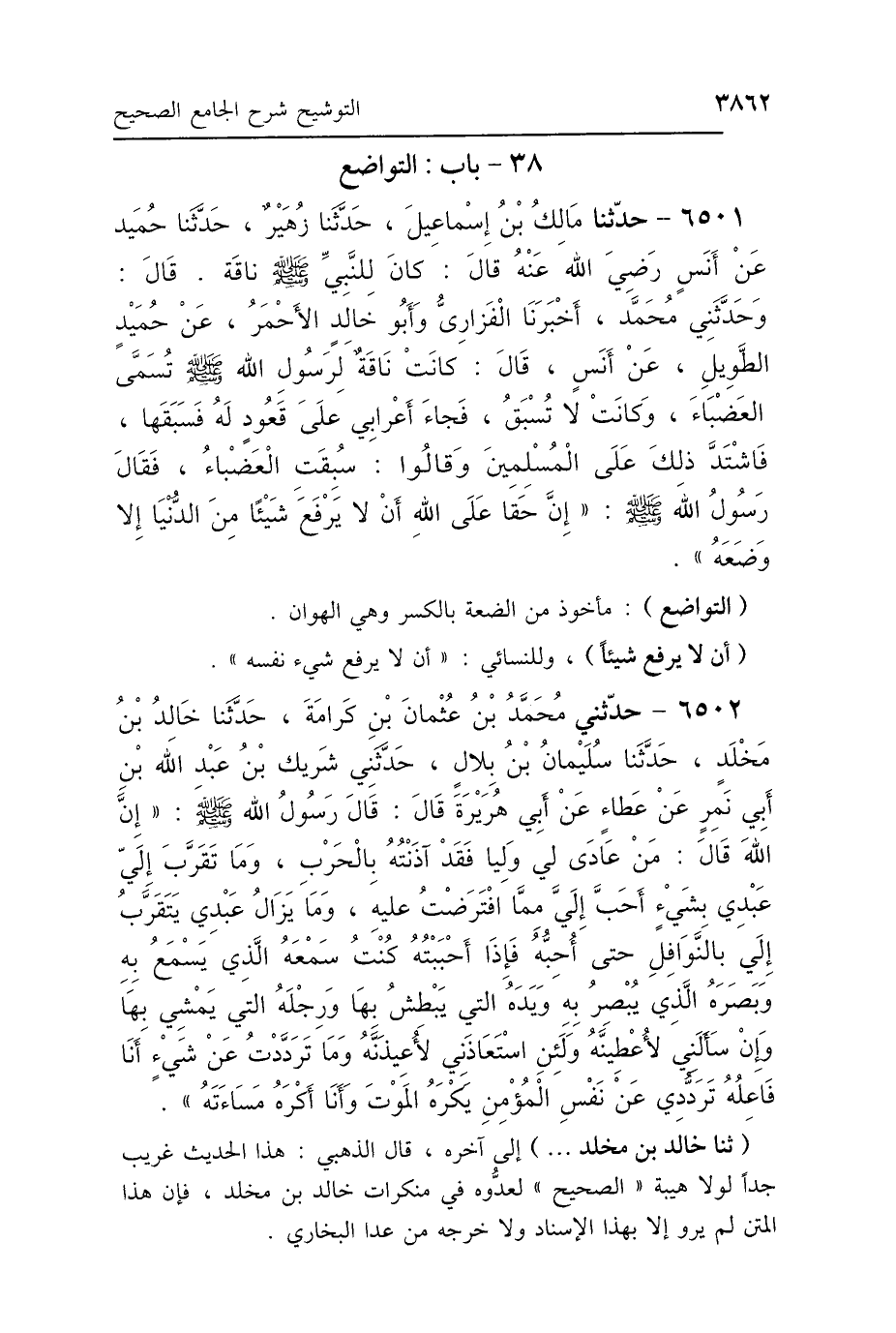 6501 - حَدَّثَنَا مَالِكُ بْنُ إِسْمَاعِيلَ، حَدَّثَنَا زُهَيْرٌ، حَدَّثَنَا حُمَيْدٌ، عَنْ أَنَسٍ رَضِيَ اللَّهُ عَنْهُ - كَانَ لِلنَّبِيِّ صَلَّى اللهُ عَلَيْهِ وَسَلَّمَ نَاقَةٌ - قَالَ: ح وَحَدَّثَنِي مُحَمَّدٌ: أَخْبَرَنَا الفَزَارِيُّ، وَأَبُو خَالِدٍ الأَحْمَرُ، عَنْ حُمَيْدٍ الطَّوِيلِ، عَنْ أَنَسٍ، قَالَ: كَانَتْ نَاقَةٌ لِرَسُولِ اللَّهِ صَلَّى اللهُ عَلَيْهِ وَسَلَّمَ تُسَمَّى: العَضْبَاءَ، وَكَانَتْ لاَ تُسْبَقُ، فَجَاءَ أَعْرَابِيٌّ عَلَى قَعُودٍ لَهُ فَسَبَقَهَا، فَاشْتَدَّ ذَلِكَ عَلَى المُسْلِمِينَ، وَقَالُوا: سُبِقَتِ العَضْبَاءُ، فَقَالَ رَسُولُ اللَّهِ صَلَّى اللهُ عَلَيْهِ وَسَلَّمَ: «إِنَّ حَقًّا عَلَى اللَّهِ أَنْ لاَ يَرْفَعَ شَيْئًا مِنَ الدُّنْيَا إِلَّا وَضَعَهُ».