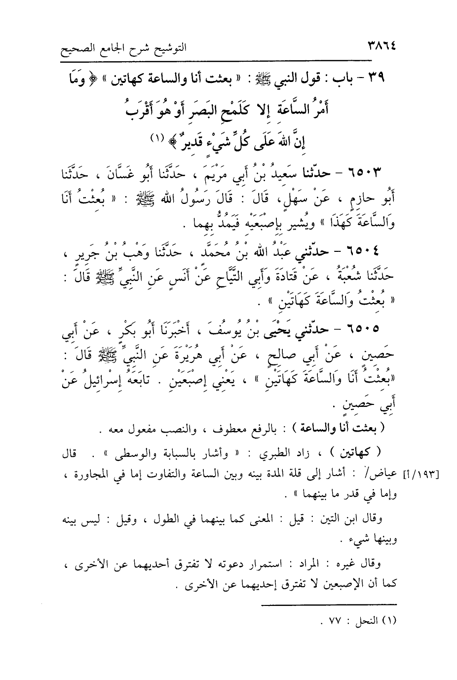 6505 - حَدَّثَنِي يَحْيَى بْنُ يُوسُفَ، أَخْبَرَنَا أَبُو بَكْرٍ، عَنْ أَبِي حَصِينٍ، عَنْ أَبِي صَالِحٍ، عَنْ أَبِي هُرَيْرَةَ، عَنِ النَّبِيِّ صَلَّى اللهُ عَلَيْهِ وَسَلَّمَ قَالَ: «بُعِثْتُ أَنَا وَالسَّاعَةُ كَهَاتَيْنِ» يَعْنِي إِصْبَعَيْنِ، تَابَعَهُ إِسْرَائِيلُ، عَنْ أَبِي حَصِينٍ.