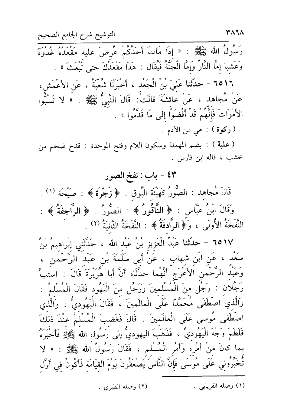 6517 - حَدَّثَنِي عَبْدُ العَزِيزِ بْنُ عَبْدِ اللَّهِ، قَالَ: حَدَّثَنِي إِبْرَاهِيمُ بْنُ سَعْدٍ، عَنِ ابْنِ شِهَابٍ، عَنْ أَبِي سَلَمَةَ بْنِ عَبْدِ الرَّحْمَنِ، وَعَبْدِ الرَّحْمَنِ الأَعْرَجِ، أَنَّهُمَا حَدَّثَاهُ: أَنَّ أَبَا هُرَيْرَةَ، قَالَ: اسْتَبَّ رَجُلاَنِ: رَجُلٌ مِنَ المُسْلِمِينَ، وَرَجُلٌ مِنَ اليَهُودِ، فَقَالَ المُسْلِمُ: وَالَّذِي اصْطَفَى مُحَمَّدًا عَلَى العَالَمِينَ، فَقَالَ اليَهُودِيُّ: وَالَّذِي اصْطَفَى مُوسَى عَلَى العَالَمِينَ، قَالَ: فَغَضِبَ المُسْلِمُ عِنْدَ ذَلِكَ فَلَطَمَ وَجْهَ اليَهُودِيِّ، فَذَهَبَ اليَهُودِيُّ إِلَى رَسُولِ اللَّهِ صَلَّى اللهُ عَلَيْهِ وَسَلَّمَ، فَأَخْبَرَهُ بِمَا كَانَ مِنْ أَمْرِهِ وَأَمْرِ المُسْلِمِ، فَقَالَ رَسُولُ اللَّهِ صَلَّى اللهُ عَلَيْهِ وَسَلَّمَ: «لاَ تُخَيِّرُونِي عَلَى مُوسَى، فَإِنَّ النَّاسَ يَصْعَقُونَ يَوْمَ القِيَامَةِ، فَأَكُونُ فِي أَوَّلِ