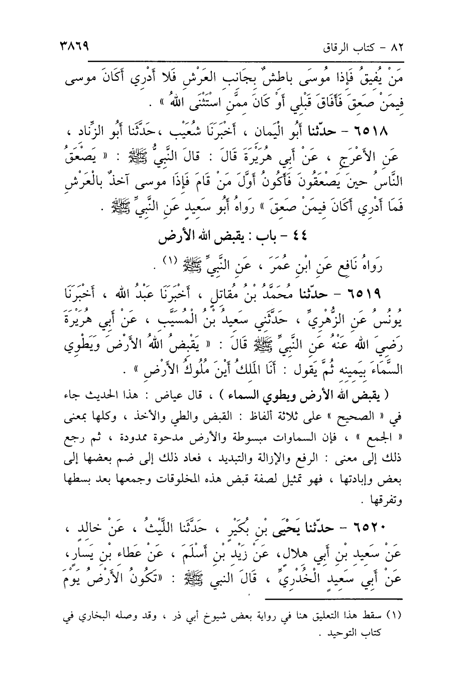 6519 - حَدَّثَنَا مُحَمَّدُ بْنُ مُقَاتِلٍ، أَخْبَرَنَا عَبْدُ اللَّهِ، أَخْبَرَنَا يُونُسُ، عَنِ الزُّهْرِيِّ، حَدَّثَنِي سَعِيدُ بْنُ المُسَيِّبِ، عَنْ أَبِي هُرَيْرَةَ رَضِيَ اللَّهُ عَنْهُ، عَنِ النَّبِيِّ صَلَّى اللهُ عَلَيْهِ وَسَلَّمَ قَالَ: "يَقْبِضُ اللَّهُ الأَرْضَ، وَيَطْوِي السَّمَاءَ بِيَمِينِهِ، ثُمَّ يَقُولُ: أَنَا المَلِكُ، أَيْنَ مُلُوكُ الأَرْضِ".