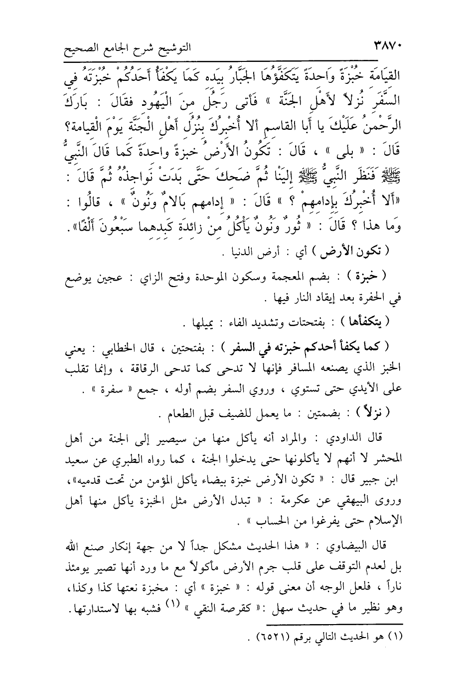 قال البيضاوي: "هذا الحديث مشكل جدًّا لا من جهة إنكار صنع الله بل لعدم التوقف على قلب جرم الأرض مأكولًا مع ما ورد أنها تصير يومئذ نارًا، فلعل الوجه أن معنى قوله: "خبزة" أي: مخبزة نعتها كذا وكذا، وهو نظير ما في حديث سهل: "كقرصة النقي" (1) فشبه بها لاستدارتها.