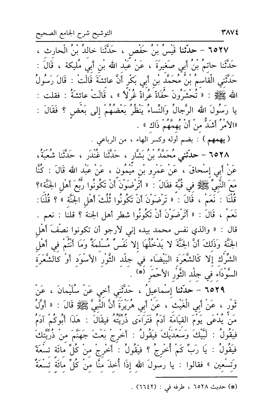 6527 - حَدَّثَنَا قَيْسُ بْنُ حَفْصٍ، حَدَّثَنَا خَالِدُ بْنُ الحَارِثِ، حَدَّثَنَا حَاتِمُ بْنُ أَبِي صَغِيرَةَ، عَنْ عَبْدِ اللَّهِ بْنِ أَبِي مُلَيْكَةَ، قَالَ: حَدَّثَنِي القَاسِمُ بْنُ مُحَمَّدِ بْنِ أَبِي بَكْرٍ، أَنَّ عَائِشَةَ رَضِيَ اللَّهُ عَنْهَا، قَالَتْ: قَالَ رَسُولُ اللَّهِ صَلَّى اللهُ عَلَيْهِ وَسَلَّمَ: «تُحْشَرُونَ حُفَاةً عُرَاةً غُرْلًا» قَالَتْ عَائِشَةُ: فَقُلْتُ: يَا رَسُولَ اللَّهِ، الرِّجَالُ وَالنِّسَاءُ يَنْظُرُ بَعْضُهُمْ إِلَى بَعْضٍ؟ فَقَالَ: «الأَمْرُ أَشَدُّ مِنْ أَنْ يُهِمَّهُمْ ذَاكِ».