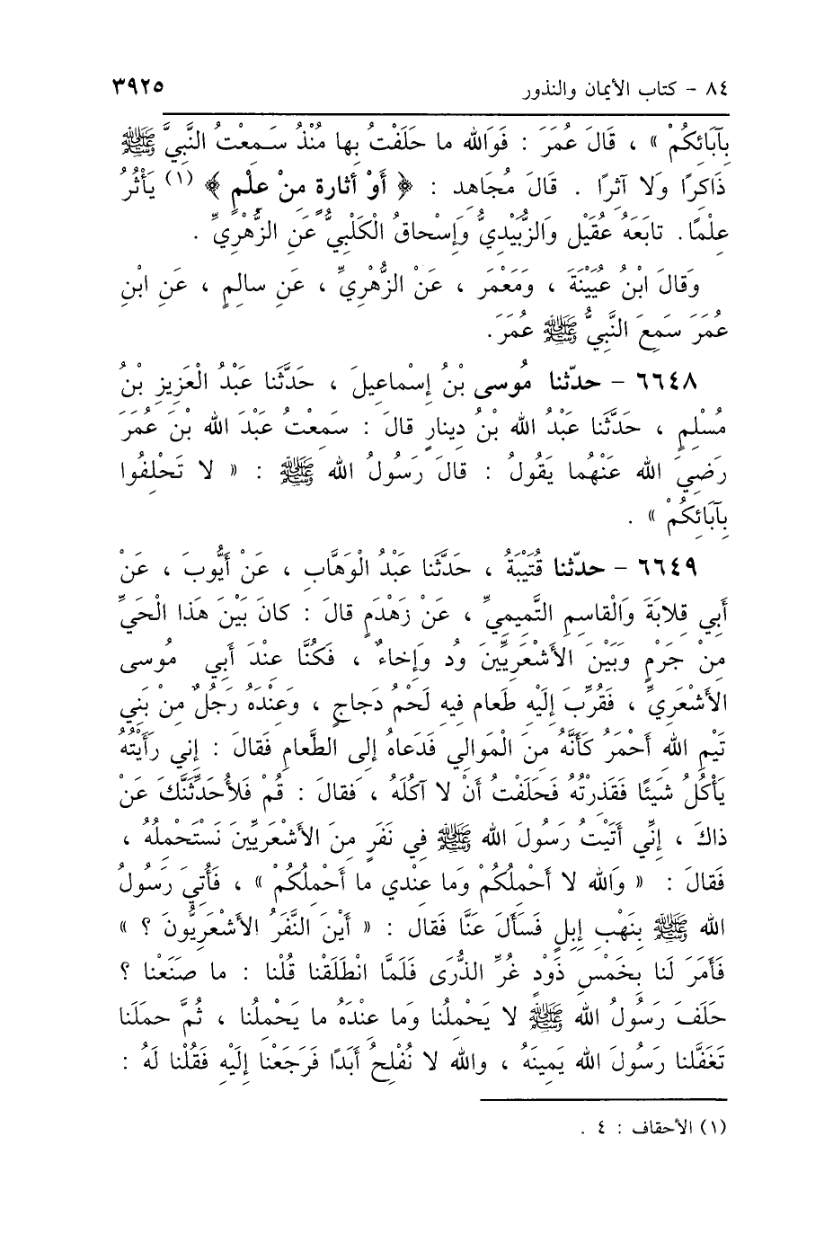 6648 - حَدَّثَنَا مُوسَى بْنُ إِسْمَاعِيلَ، حَدَّثَنَا عَبْدُ العَزِيزِ بْنُ مُسْلِمٍ، حَدَّثَنَا عَبْدُ اللَّهِ بْنُ دِينَارٍ، قَالَ: سَمِعْتُ عَبْدَ اللَّهِ بْنَ عُمَرَ رَضِيَ اللَّهُ عَنْهُمَا، يَقُولُ: قَالَ رَسُولُ اللَّهِ صَلَّى اللهُ عَلَيْهِ وَسَلَّمَ: «لاَ تَحْلِفُوا بِآبَائِكُمْ».