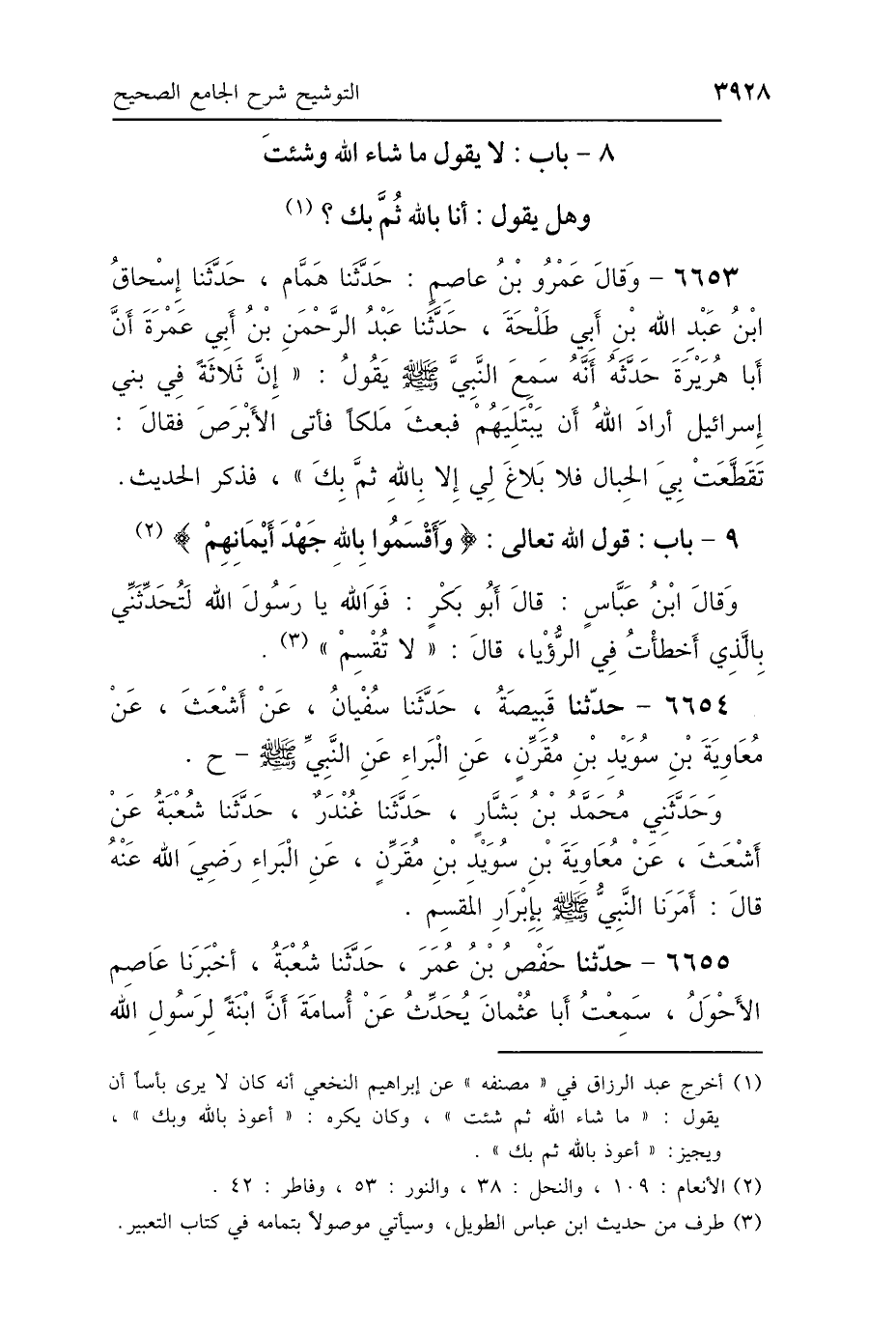 8 - بَابُ لاَ يَقُولُ: مَا شَاءَ اللَّهُ وَشِئْتَ، وَهَلْ يَقُولُ أَنَا بِاللَّهِ ثُمَّ بِكَ؟