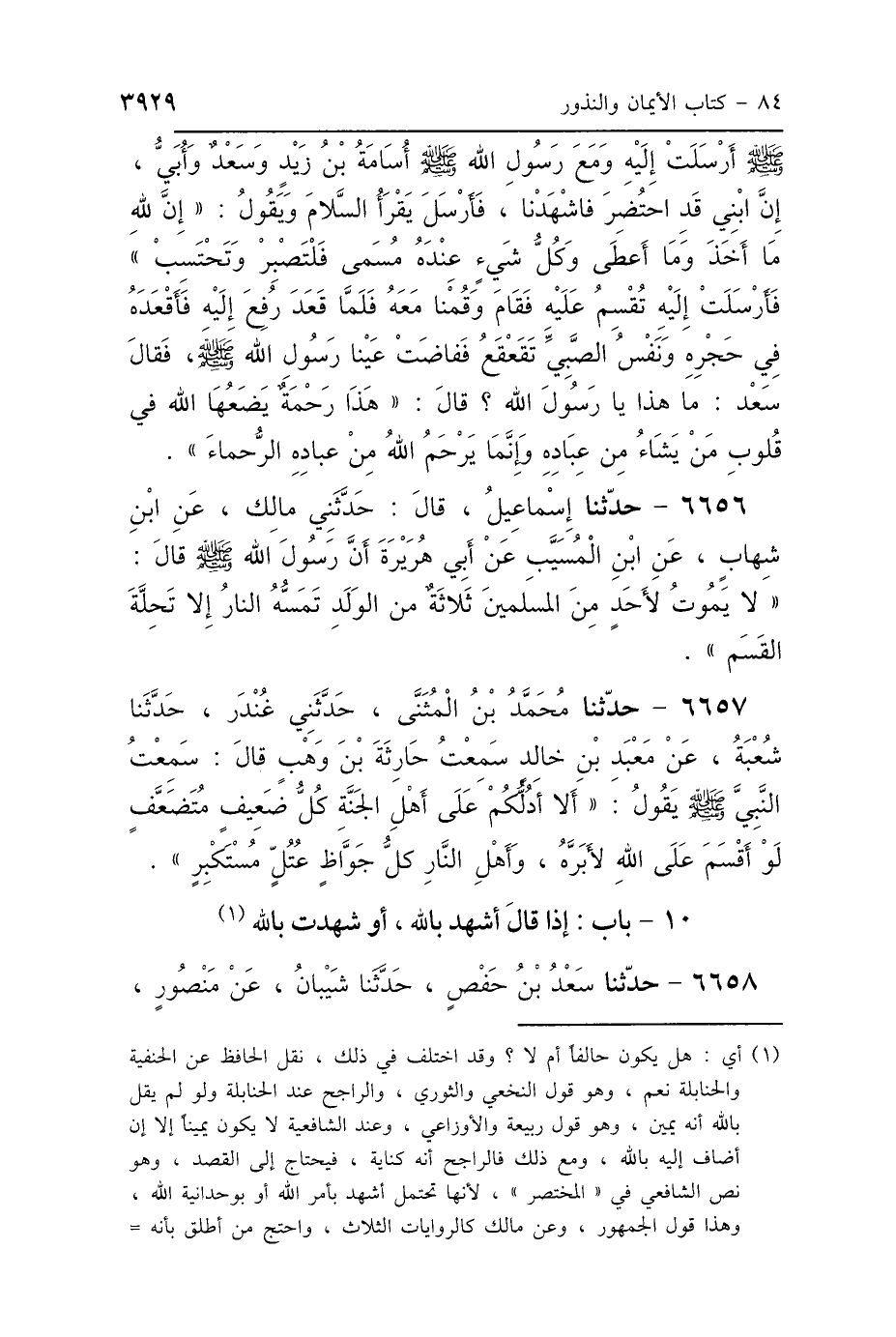صَلَّى اللهُ عَلَيْهِ وَسَلَّمَ أَرْسَلَتْ إِلَيْهِ، وَمَعَ رَسُولِ اللَّهِ صَلَّى اللهُ عَلَيْهِ وَسَلَّمَ أُسَامَةُ بْنُ زَيْدٍ، وَسَعْدٌ، وَأُبَيٌّ، أَنَّ ابْنِي قَدْ احْتُضِرَ فَاشْهَدْنَا، فَأَرْسَلَ يَقْرَأُ السَّلاَمَ وَيَقُولُ: «إِنَّ لِلَّهِ مَا أَخَذَ وَمَا أَعْطَى، وَكُلُّ شَيْءٍ عِنْدَهُ مُسَمًّى، فَلْتَصْبِرْ وَتَحْتَسِبْ» فَأَرْسَلَتْ إِلَيْهِ تُقْسِمُ عَلَيْهِ، فَقَامَ وَقُمْنَا مَعَهُ، فَلَمَّا قَعَدَ رُفِعَ إِلَيْهِ، فَأَقْعَدَهُ فِي حَجْرِهِ، وَنَفْسُ الصَّبِيِّ جُئِّثُ، فَفَاضَتْ عَيْنَا رَسُولِ اللَّهِ صَلَّى اللهُ عَلَيْهِ وَسَلَّمَ، فَقَالَ سَعْدٌ: مَا هَذَا يَا رَسُولَ اللَّهِ؟ قَالَ: «هَذِهِ رَحْمَةٌ يَضَعُهَا اللَّهُ فِي قُلُوبِ مَنْ يَشَاءُ مِنْ عِبَادِهِ، وَإِنَّمَا يَرْحَمُ اللَّهُ مِنْ عِبَادِهِ الرُّحَمَاءَ».