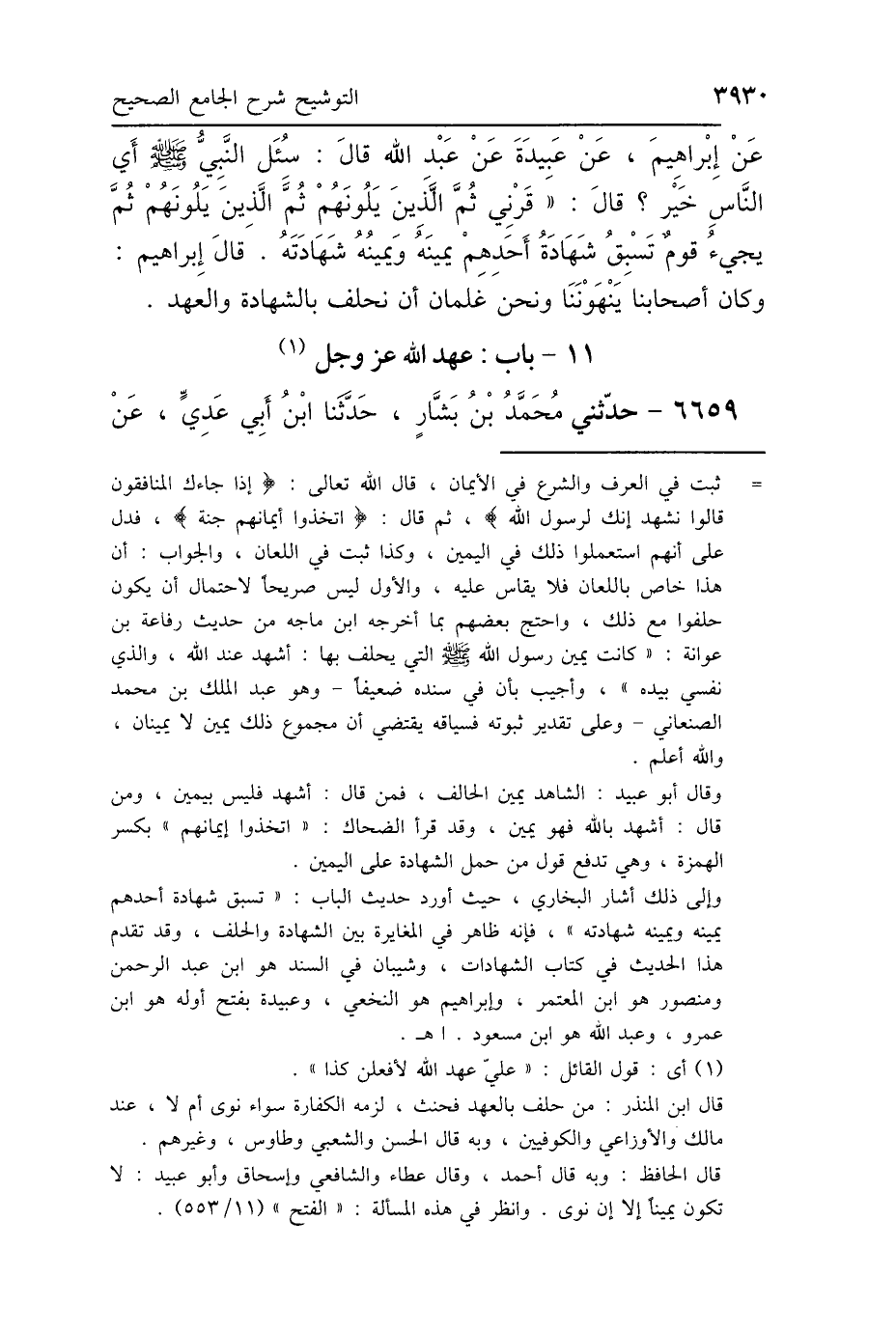 عَنْ إِبْرَاهِيمَ، عَنْ عَبِيدَةَ، عَنْ عَبْدِ اللَّهِ، قَالَ: سُئِلَ النَّبِيُّ صَلَّى اللهُ عَلَيْهِ وَسَلَّمَ أَيُّ النَّاسِ خَيْرٌ؟ قَالَ: " قَرْنِي، ثُمَّ الَّذِينَ يَلُونَهُمْ، ثُمَّ الَّذِينَ يَلُونَهُمْ، ثُمَّ يَجِيءُ قَوْمٌ: تَسْبِقُ شَهَادَةُ أَحَدِهِمْ يَمِينَهُ وَيَمِينُهُ شَهَادَتَهُ " قَالَ إِبْرَاهِيمُ: «وَكَانَ أَصْحَابُنَا يَنْهَوْنَا - وَنَحْنُ غِلْمَانٌ - أَنْ نَحْلِفَ بِالشَّهَادَةِ وَالعَهْدِ».
