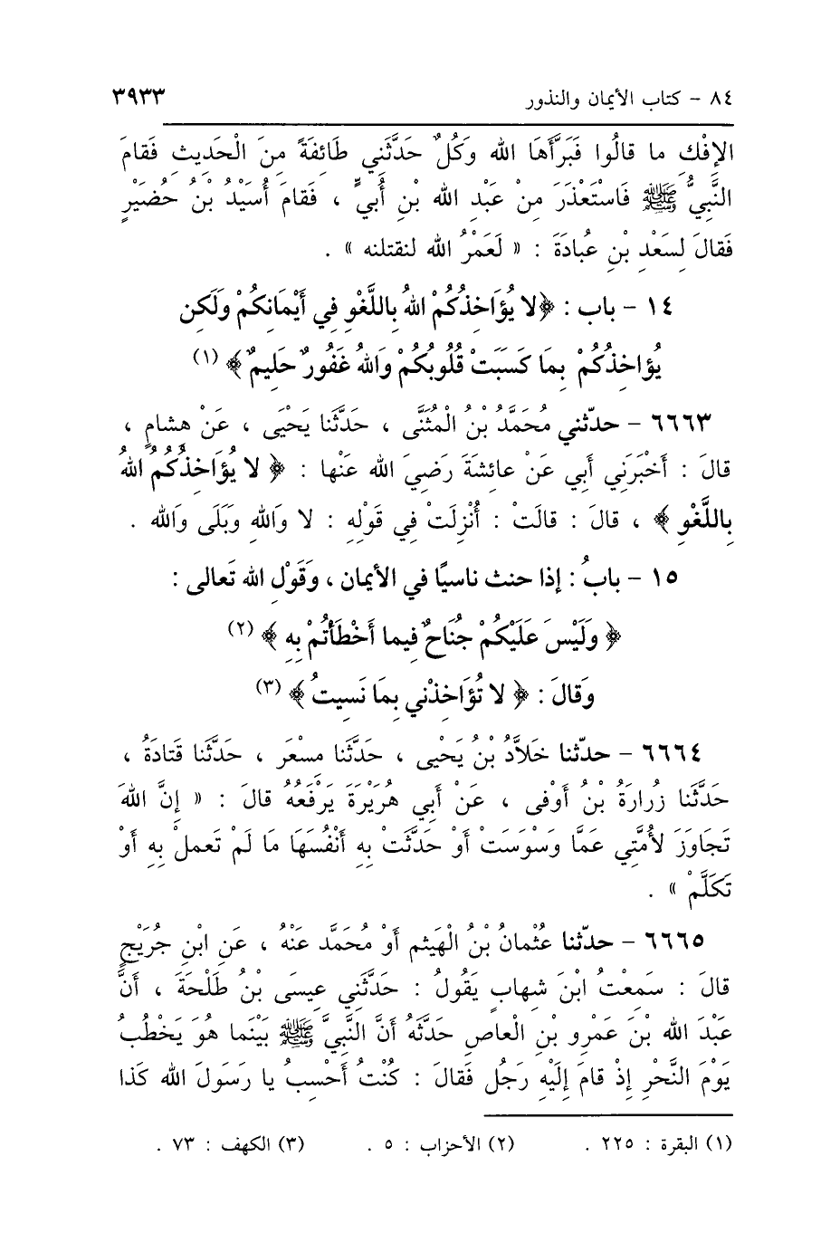 14 - بَابُ {لاَ يُؤَاخِذُكُمُ اللَّهُ بِاللَّغْوِ فِي أَيْمَانِكُمْ، وَلَكِنْ يُؤَاخِذُكُمْ بِمَا كَسَبَتْ قُلُوبُكُمْ وَاللَّهُ غَفُورٌ حَلِيمٌ} [البقرة: 225]
