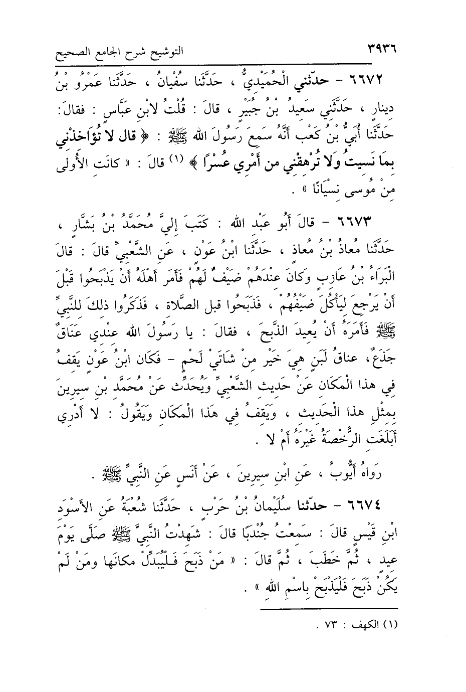 6673 - قَالَ أَبُو عَبْدِ اللَّهِ: كَتَبَ إِلَيَّ مُحَمَّدُ بْنُ بَشَّارٍ، حَدَّثَنَا مُعَاذُ بْنُ مُعَاذٍ، حَدَّثَنَا ابْنُ عَوْنٍ، عَنِ الشَّعْبِيِّ، قَالَ: قَالَ البَرَاءُ بْنُ عَازِبٍ: «وَكَانَ عِنْدَهُمْ ضَيْفٌ لَهُمْ، فَأَمَرَ أَهْلَهُ أَنْ يَذْبَحُوا قَبْلَ أَنْ يَرْجِعَ، لِيَأْكُلَ ضَيْفُهُمْ، فَذَبَحُوا قَبْلَ الصَّلاَةِ، فَذَكَرُوا ذَلِكَ لِلنَّبِيِّ صَلَّى اللهُ عَلَيْهِ وَسَلَّمَ، فَأَمَرَهُ أَنْ يُعِيدَ الذَّبْحَ» فَقَالَ: يَا رَسُولَ اللَّهِ، عِنْدِي عَنَاقٌ جَذَعٌ، عَنَاقُ لَبَنٍ، هِيَ خَيْرٌ مِنْ شَاتَيْ لَحْمٍ فَكَانَ ابْنُ عَوْنٍ، يَقِفُ فِي هَذَا المَكَانِ عَنْ حَدِيثِ الشَّعْبِيِّ، وَيُحَدِّثُ عَنْ مُحَمَّدِ بْنِ سِيرِينَ، بِمِثْلِ هَذَا الحَدِيثِ، وَيَقِفُ فِي هَذَا المَكَانِ، وَيَقُولُ: «لاَ أَدْرِي أَبَلَغَتِ الرُّخْصَةُ غَيْرَهُ أَمْ لاَ» رَوَاهُ أَيُّوبُ، عَنْ ابْنِ سِيرِينَ، عَنْ أَنَسٍ، عَنِ النَّبِيِّ صَلَّى اللهُ عَلَيْهِ وَسَلَّمَ.