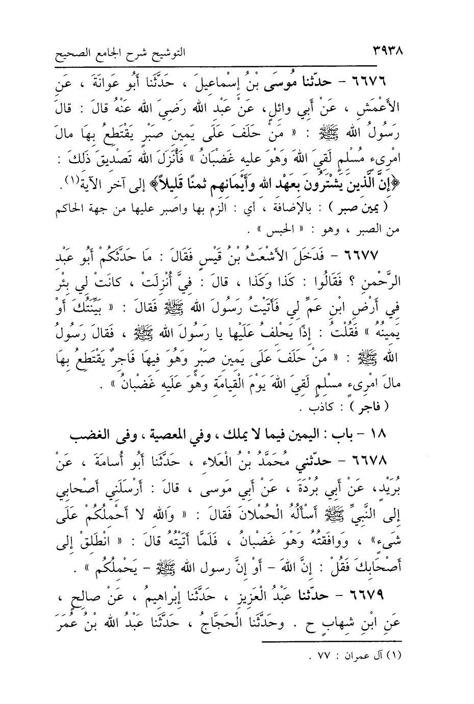 6676 - حَدَّثَنَا مُوسَى بْنُ إِسْمَاعِيلَ، حَدَّثَنَا أَبُو عَوَانَةَ، عَنِ الأَعْمَشِ، عَنْ أَبِي وَائِلٍ، عَنْ عَبْدِ اللَّهِ رَضِيَ اللَّهُ عَنْهُ، قَالَ: قَالَ رَسُولُ اللَّهِ صَلَّى اللهُ عَلَيْهِ وَسَلَّمَ: «مَنْ حَلَفَ عَلَى يَمِينِ صَبْرٍ، يَقْتَطِعُ بِهَا مَالَ امْرِئٍ مُسْلِمٍ، لَقِيَ اللَّهَ وَهُوَ عَلَيْهِ غَضْبَانُ» فَأَنْزَلَ اللَّهُ تَصْدِيقَ ذَلِكَ: {إِنَّ الَّذِينَ يَشْتَرُونَ بِعَهْدِ اللَّهِ وَأَيْمَانِهِمْ ثَمَنًا قَلِيلًا} [آل عمران: 77] إِلَى آخِرِ الآيَةِ.