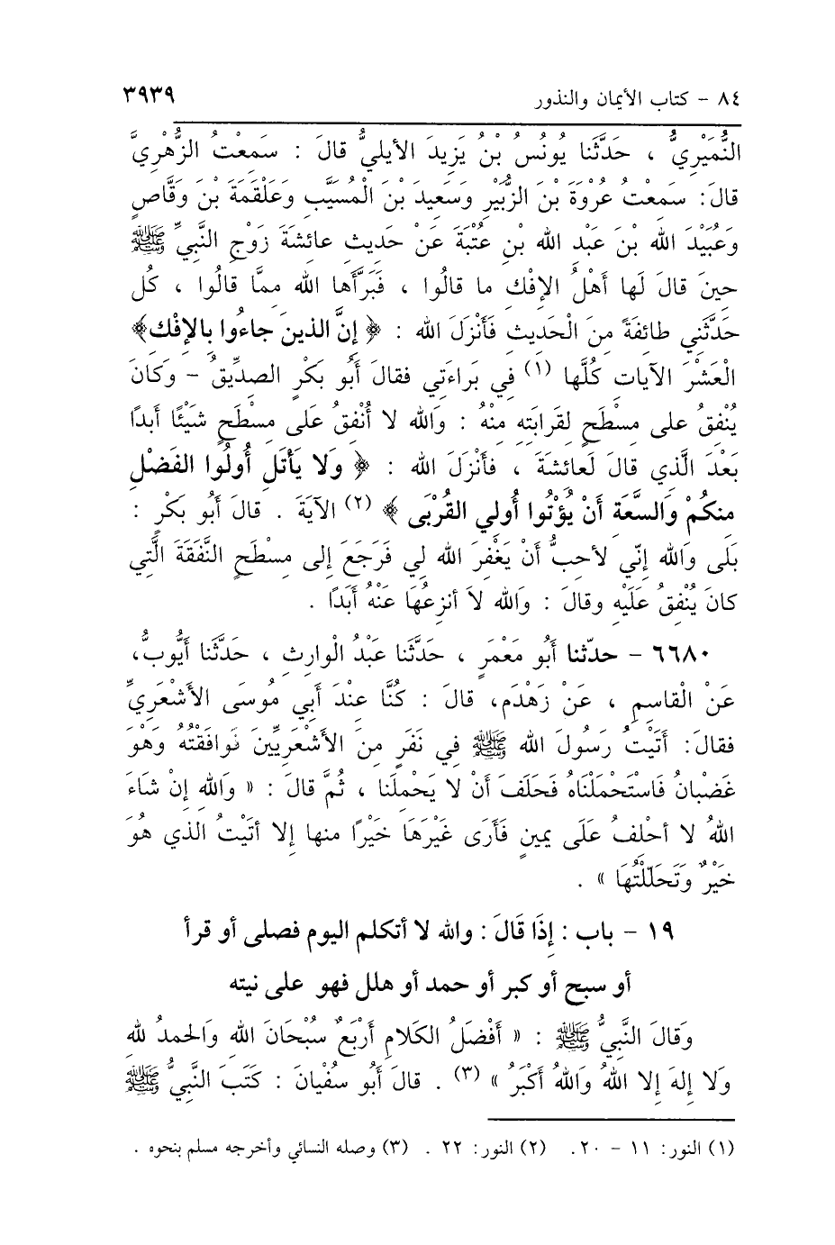 النُّمَيْرِيُّ، حَدَّثَنَا يُونُسُ بْنُ يَزِيدَ الأَيْلِيُّ، قَالَ: سَمِعْتُ الزُّهْرِيَّ، قَالَ: سَمِعْتُ عُرْوَةَ بْنَ الزُّبَيْرِ، وَسَعِيدَ بْنَ المُسَيِّبِ، وَعَلْقَمَةَ بْنَ وَقَّاصٍ، وَعُبَيْدَ اللَّهِ بْنَ عَبْدِ اللَّهِ بْنِ عُتْبَةَ، عَنْ حَدِيثِ عَائِشَةَ زَوْجِ النَّبِيِّ صَلَّى اللهُ عَلَيْهِ وَسَلَّمَ، حِينَ قَالَ لَهَا أَهْلُ الإِفْكِ مَا قَالُوا، فَبَرَّأَهَا اللَّهُ مِمَّا قَالُوا، كُلٌّ حَدَّثَنِي طَائِفَةً مِنَ الحَدِيثِ فَأَنْزَلَ اللَّهُ: {إِنَّ الَّذِينَ جَاءُوا بِالإِفْكِ} العَشْرَ الآيَاتِ كُلَّهَا فِي بَرَاءَتِي، فَقَالَ أَبُو بَكْرٍ الصِّدِّيقُ، وَكَانَ يُنْفِقُ عَلَى مِسْطَحٍ لِقَرَابَتِهِ مِنْهُ: وَاللَّهِ لاَ أُنْفِقُ عَلَى مِسْطَحٍ شَيْئًا أَبَدًا، بَعْدَ الَّذِي قَالَ لِعَائِشَةَ. فَأَنْزَلَ اللَّهُ: {وَلاَ يَأْتَلِ أُولُو الفَضْلِ مِنْكُمْ وَالسَّعَةِ، أَنْ يُؤْتُوا أُولِي القُرْبَى} الآيَةَ قَالَ أَبُو بَكْرٍ: "بَلَى وَاللَّهِ إِنِّي لَأُحِبُّ أَنْ يَغْفِرَ اللَّهُ لِي، فَرَجَعَ إِلَى مِسْطَحٍ النَّفَقَةَ الَّتِي كَانَ يُنْفِقُ عَلَيْهِ، وَقَالَ: وَاللَّهِ لاَ أَنْزِعُهَا عَنْهُ أَبَدًا".