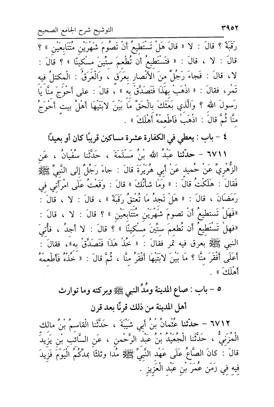 6711 - حَدَّثَنَا عَبْدُ اللَّهِ بْنُ مَسْلَمَةَ، حَدَّثَنَا سُفْيَانُ، عَنِ الزُّهْرِيِّ، عَنْ حُمَيْدٍ، عَنْ أَبِي هُرَيْرَةَ، قَالَ: جَاءَ رَجُلٌ إِلَى النَّبِيِّ صَلَّى اللهُ عَلَيْهِ وَسَلَّمَ فَقَالَ: هَلَكْتُ، قَالَ: «وَمَا شَأْنُكَ؟» قَالَ: وَقَعْتُ عَلَى امْرَأَتِي فِي رَمَضَانَ، قَالَ: «هَلْ تَجِدُ مَا تُعْتِقُ رَقَبَةً» قَالَ: لاَ، قَالَ: «فَهَلْ تَسْتَطِيعُ أَنْ تَصُومَ شَهْرَيْنِ مُتَتَابِعَيْنِ» قَالَ: لاَ، قَالَ: «فَهَلْ تَسْتَطِيعُ أَنْ تُطْعِمَ سِتِّينَ مِسْكِينًا» قَالَ: لاَ أَجِدُ، فَأُتِيَ النَّبِيُّ صَلَّى اللهُ عَلَيْهِ وَسَلَّمَ بِعَرَقٍ فِيهِ تَمْرٌ، فَقَالَ: «خُذْ هَذَا فَتَصَدَّقْ بِهِ» فَقَالَ: أَعَلَى أَفْقَرَ مِنَّا؟ مَا بَيْنَ لاَبَتَيْهَا أَفْقَرُ مِنَّا، ثُمَّ قَالَ: «خُذْهُ فَأَطْعِمْهُ أَهْلَكَ».