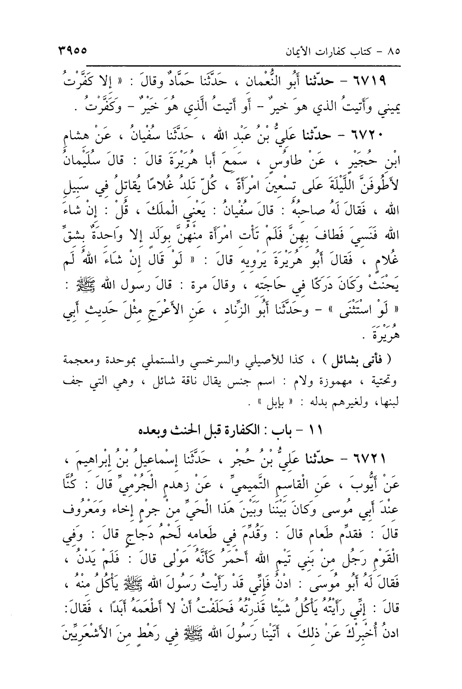 6719 - حَدَّثَنَا أَبُو النُّعْمَانِ، حَدَّثَنَا حَمَّادٌ، وَقَالَ: " إِلَّا كَفَّرْتُ عَنْ يَمِينِي، وَأَتَيْتُ الَّذِي هُوَ خَيْرٌ - أَوْ: أَتَيْتُ الَّذِي هُوَ خَيْرٌ وَكَفَّرْتُ - ".