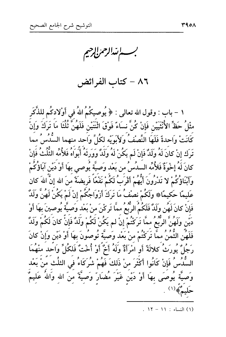 1 - بَابُ قَوْلِ اللَّهِ تَعَالَى: {يُوصِيكُمُ اللَّهُ فِي أَوْلاَدِكُمْ لِلذَّكَرِ مِثْلُ حَظِّ الأُنْثَيَيْنِ، فَإِنْ كُنَّ نِسَاءً فَوْقَ اثْنَتَيْنِ فَلَهُنَّ ثُلُثَا مَا تَرَكَ، وَإِنْ كَانَتْ وَاحِدَةً فَلَهَا النِّصْفُ، وَلِأَبَوَيْهِ لِكُلِّ وَاحِدٍ مِنْهُمَا السُّدُسُ مِمَّا تَرَكَ، إِنْ كَانَ لَهُ وَلَدٌ، فَإِنْ لَمْ يَكُنْ لَهُ وَلَدٌ وَوَرِثَهُ أَبَوَاهُ فَلِأُمِّهِ الثُّلُثُ، فَإِنْ كَانَ لَهُ إِخْوَةٌ فَلِأُمِّهِ السُّدُسُ، مِنْ بَعْدِ وَصِيَّةٍ يُوصِي بِهَا أَوْ دَيْنٍ، آبَاؤُكُمْ وَأَبْنَاؤُكُمْ لاَ تَدْرُونَ أَيُّهُمْ أَقْرَبُ لَكُمْ نَفْعًا فَرِيضَةً مِنَ اللَّهِ، إِنَّ اللَّهَ كَانَ عَلِيمًا حَكِيمًا، وَلَكُمْ نِصْفُ مَا تَرَكَ أَزْوَاجُكُمْ، إِنْ لَمْ يَكُنْ لَهُنَّ وَلَدٌ، فَإِنْ كَانَ لَهُنَّ وَلَدٌ فَلَكُمُ الرُّبُعُ مِمَّا تَرَكْنَ مِنْ بَعْدِ وَصِيَّةٍ يُوصِينَ بِهَا أَوْ دَيْنٍ، وَلَهُنَّ الرُّبُعُ مِمَّا تَرَكْتُمْ، إِنْ لَمْ يَكُنْ لَكُمْ وَلَدٌ، فَإِنْ كَانَ لَكُمْ وَلَدٌ فَلَهُنَّ الثُّمُنُ مِمَّا تَرَكْتُمْ، مِنْ بَعْدِ وَصِيَّةٍ تُوصُونَ بِهَا أَوْ دَيْنٍ، وَإِنْ كَانَ رَجُلٌ يُورَثُ كَلاَلَةً أَوِ امْرَأَةٌ، وَلَهُ أَخٌ أَوْ أُخْتٌ فَلِكُلِّ وَاحِدٍ مِنْهُمَا السُّدُسُ، فَإِنْ كَانُوا أَكْثَرَ مِنْ ذَلِكَ فَهُمْ شُرَكَاءُ فِي الثُّلُثِ، مِنْ بَعْدِ وَصِيَّةٍ يُوصَى بِهَا، أَوْ دَيْنٍ غَيْرَ مُضَارٍّ وَصِيَّةً مِنَ اللَّهِ، وَاللَّهُ عَلِيمٌ حَلِيمٌ} [النساء: 12]