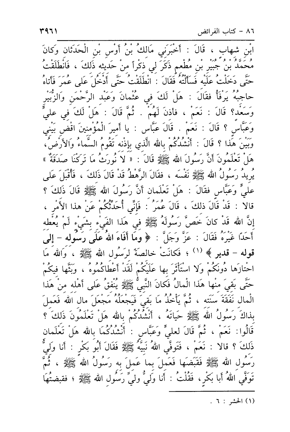ابْنِ شِهَابٍ، قَالَ: أَخْبَرَنِي مَالِكُ بْنُ أَوْسِ بْنِ الحَدَثَانِ، وَكَانَ مُحَمَّدُ بْنُ جُبَيْرِ بْنِ مُطْعِمٍ، ذَكَرَ لِي مِنْ حَدِيثِهِ ذَلِكَ، فَانْطَلَقْتُ حَتَّى دَخَلْتُ عَلَيْهِ فَسَأَلْتُهُ فَقَالَ: انْطَلَقْتُ حَتَّى أَدْخُلَ عَلَى عُمَرَ، فَأَتَاهُ حَاجِبُهُ يَرْفَأُ فَقَالَ: هَلْ لَكَ فِي عُثْمَانَ، وَعَبْدِ الرَّحْمَنِ، وَالزُّبَيْرِ، وَسَعْدٍ؟ قَالَ: نَعَمْ، فَأَذِنَ لَهُمْ، ثُمَّ قَالَ: هَلْ لَكَ فِي عَلِيٍّ، وَعَبَّاسٍ؟ قَالَ: نَعَمْ، قَالَ عَبَّاسٌ: يَا أَمِيرَ المُؤْمِنِينَ اقْضِ بَيْنِي وَبَيْنَ هَذَا، قَالَ أَنْشُدُكُمْ بِاللَّهِ الَّذِي بِإِذْنِهِ تَقُومُ السَّمَاءُ وَالأَرْضُ، هَلْ تَعْلَمُونَ أَنَّ رَسُولَ اللَّهِ صَلَّى اللهُ عَلَيْهِ وَسَلَّمَ قَالَ: «لاَ نُورَثُ مَا تَرَكْنَا صَدَقَةٌ» يُرِيدُ رَسُولُ اللَّهِ صَلَّى اللهُ عَلَيْهِ وَسَلَّمَ نَفْسَهُ، فَقَالَ الرَّهْطُ: قَدْ قَالَ ذَلِكَ، فَأَقْبَلَ عَلَى عَلِيٍّ وَعَبَّاسٍ، فَقَالَ: هَلْ تَعْلَمَانِ أَنَّ رَسُولَ اللَّهِ صَلَّى اللهُ عَلَيْهِ وَسَلَّمَ قَالَ ذَلِكَ؟ قَالاَ: قَدْ قَالَ ذَلِكَ. قَالَ عُمَرُ: فَإِنِّي أُحَدِّثُكُمْ عَنْ هَذَا الأَمْرِ، إِنَّ اللَّهَ قَدْ كَانَ خَصَّ رَسُولَهُ صَلَّى اللهُ عَلَيْهِ وَسَلَّمَ فِي هَذَا الفَيْءِ بِشَيْءٍ لَمْ يُعْطِهِ أَحَدًا غَيْرَهُ، فَقَالَ عَزَّ وَجَلَّ: {مَا أَفَاءَ اللَّهُ عَلَى رَسُولِهِ} [الحشر: 7]- إِلَى قَوْلِهِ - {قَدِيرٌ} [الحشر: 6] فَكَانَتْ خَالِصَةً لِرَسُولِ اللَّهِ صَلَّى اللهُ عَلَيْهِ وَسَلَّمَ، وَاللَّهِ مَا احْتَازَهَا دُونَكُمْ وَلاَ اسْتَأْثَرَ بِهَا عَلَيْكُمْ، لَقَدْ أَعْطَاكُمُوهَا وَبَثَّهَا فِيكُمْ حَتَّى بَقِيَ مِنْهَا هَذَا المَالُ، فَكَانَ النَّبِيُّ صَلَّى اللهُ عَلَيْهِ وَسَلَّمَ يُنْفِقُ عَلَى أَهْلِهِ مِنْ هَذَا المَالِ نَفَقَةَ سَنَتِهِ، ثُمَّ يَأْخُذُ مَا بَقِيَ فَيَجْعَلُهُ مَجْعَلَ مَالِ اللَّهِ، فَعَمِلَ بِذَاكَ رَسُولُ اللَّهِ صَلَّى اللهُ عَلَيْهِ وَسَلَّمَ حَيَاتَهُ، أَنْشُدُكُمْ بِاللَّهِ هَلْ تَعْلَمُونَ ذَلِكَ؟ قَالُوا: نَعَمْ، ثُمَّ قَالَ لِعَلِيٍّ وَعَبَّاسٍ: أَنْشُدُكُمَا بِاللَّهِ، هَلْ تَعْلَمَانِ ذَلِكَ؟ قَالاَ: نَعَمْ، فَتَوَفَّى اللَّهُ نَبِيَّهُ صَلَّى اللهُ عَلَيْهِ وَسَلَّمَ فَقَالَ أَبُو بَكْرٍ: أَنَا وَلِيُّ رَسُولِ اللَّهِ صَلَّى اللهُ عَلَيْهِ وَسَلَّمَ، فَقَبَضَهَا