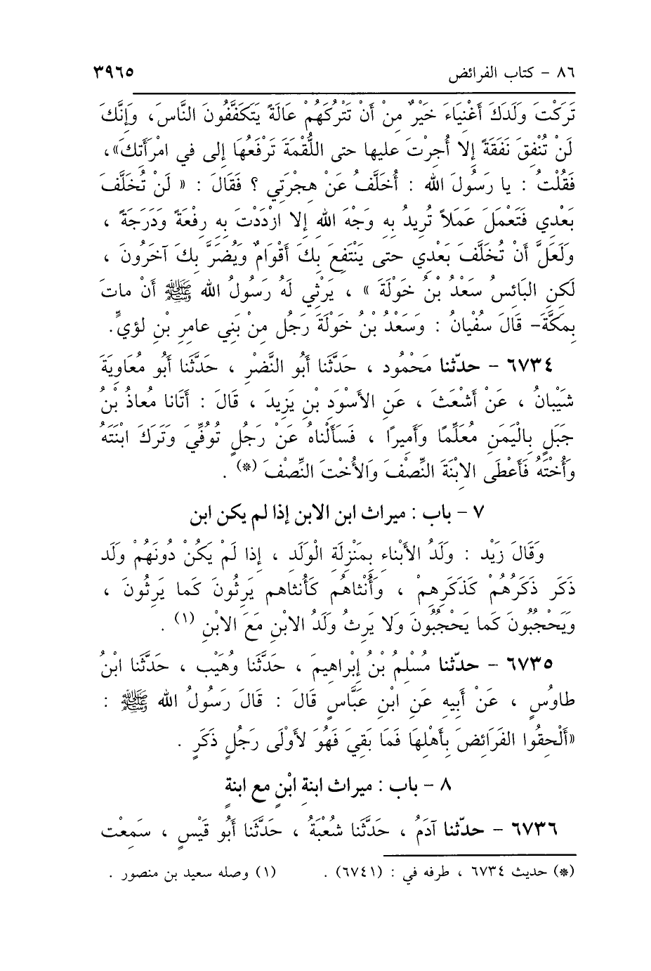 تَرَكْتَ وَلَدَكَ أَغْنِيَاءَ خَيْرٌ مِنْ أَنْ تَتْرُكَهُمْ عَالَةً يَتَكَفَّفُونَ النَّاسَ، وَإِنَّكَ لَنْ تُنْفِقَ نَفَقَةً إِلَّا أُجِرْتَ عَلَيْهَا، حَتَّى اللُّقْمَةَ تَرْفَعُهَا إِلَى فِي امْرَأَتِكَ» فَقُلْتُ: يَا رَسُولَ اللَّهِ، آأُخَلَّفُ عَنْ هِجْرَتِي؟ فَقَالَ: «لَنْ تُخَلَّفَ بَعْدِي، فَتَعْمَلَ عَمَلًا تُرِيدُ بِهِ وَجْهَ اللَّهِ، إِلَّا ازْدَدْتَ بِهِ رِفْعَةً وَدَرَجَةً، وَلَعَلَّ أَنْ تُخَلَّفَ بَعْدِي حَتَّى يَنْتَفِعَ بِكَ أَقْوَامٌ وَيُضَرَّ بِكَ آخَرُونَ، لَكِنِ البَائِسُ سَعْدُ ابْنُ خَوْلَةَ» يَرْثِي لَهُ رَسُولُ اللَّهِ صَلَّى اللهُ عَلَيْهِ وَسَلَّمَ أَنْ مَاتَ بِمَكَّةَ، قَالَ سُفْيَانُ: «وَسَعْدُ ابْنُ خَوْلَةَ رَجُلٌ مِنْ بَنِي عَامِرِ بْنِ لُؤَيٍّ».