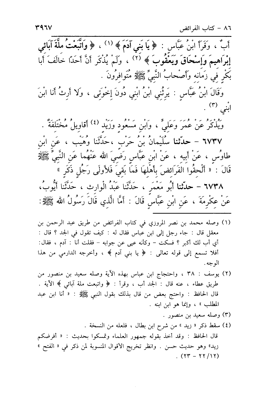 أَبٌ» وَقَرَأَ ابْنُ عَبَّاسٍ: {يَا بَنِي آدَمَ} [الأعراف: 26] {وَاتَّبَعْتُ مِلَّةَ آبَائِي إِبْرَاهِيمَ وَإِسْحَاقَ وَيَعْقُوبَ} «وَلَمْ يُذْكَرْ أَنَّ أَحَدًا خَالَفَ أَبَا بَكْرٍ فِي زَمَانِهِ، وَأَصْحَابُ النَّبِيِّ صَلَّى اللهُ عَلَيْهِ وَسَلَّمَ مُتَوَافِرُونَ» وَقَالَ ابْنُ عَبَّاسٍ: «يَرِثُنِي ابْنُ ابْنِي دُونَ إِخْوَتِي، وَلاَ أَرِثُ أَنَا ابْنَ ابْنِي؟» وَيُذْكَرُ عَنْ عُمَرَ، وَعَلِيٍّ، وَابْنِ مَسْعُودٍ، وَزَيْدٍ، أَقَاوِيلُ مُخْتَلِفَةٌ.