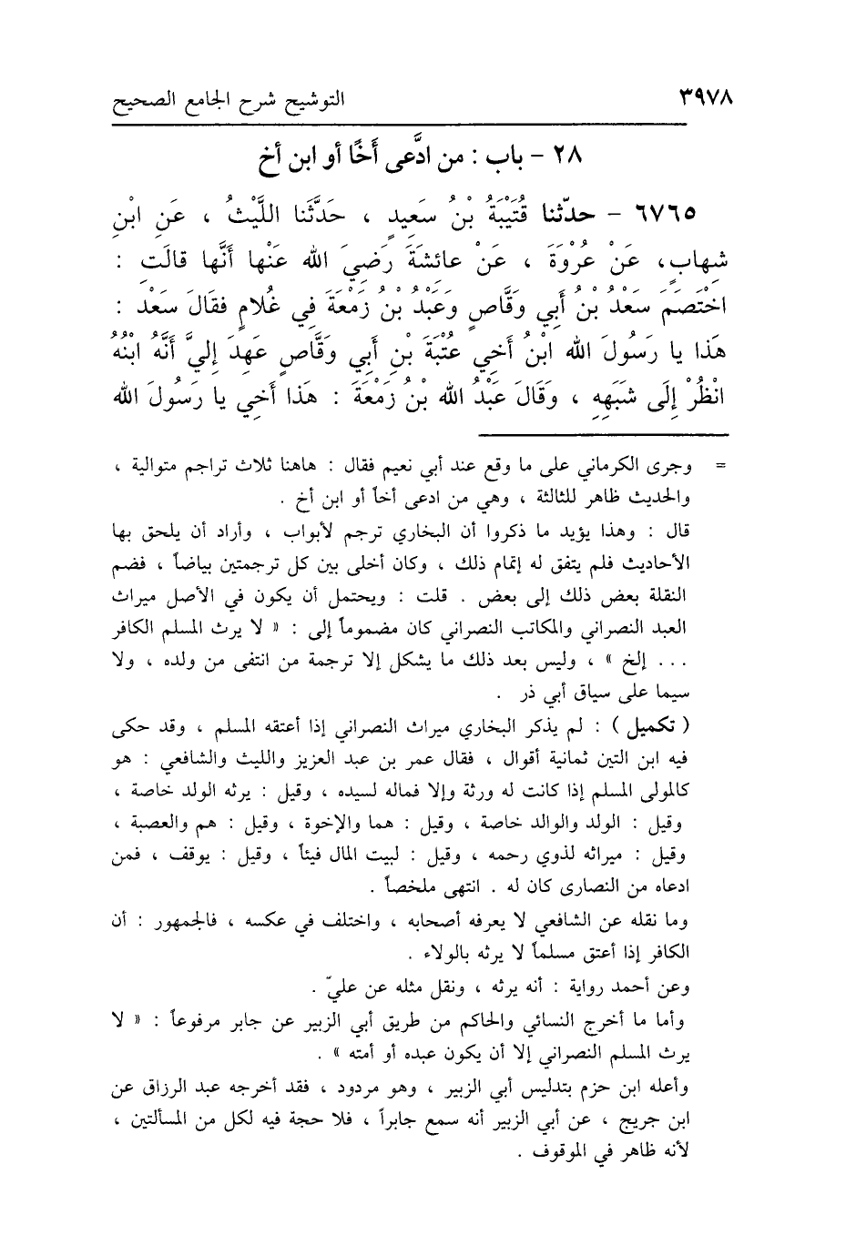 6765 - حَدَّثَنَا قُتَيْبَةُ بْنُ سَعِيدٍ، حَدَّثَنَا اللَّيْثُ، عَنِ ابْنِ شِهَابٍ، عَنْ عُرْوَةَ، عَنْ عَائِشَةَ رَضِيَ اللَّهُ عَنْهَا، أَنَّهَا قَالَتْ: اخْتَصَمَ سَعْدُ بْنُ أَبِي وَقَّاصٍ وَعَبْدُ بْنُ زَمْعَةَ فِي غُلاَمٍ، فَقَالَ سَعْدٌ: هَذَا يَا رَسُولَ اللَّهِ ابْنُ أَخِي عُتْبَةَ بْنِ أَبِي وَقَّاصٍ، عَهِدَ إِلَيَّ أَنَّهُ ابْنُهُ، انْظُرْ إِلَى شَبَهِهِ، وَقَالَ عَبْدُ بْنُ زَمْعَةَ: هَذَا أَخِي يَا رَسُولَ اللَّهِ،