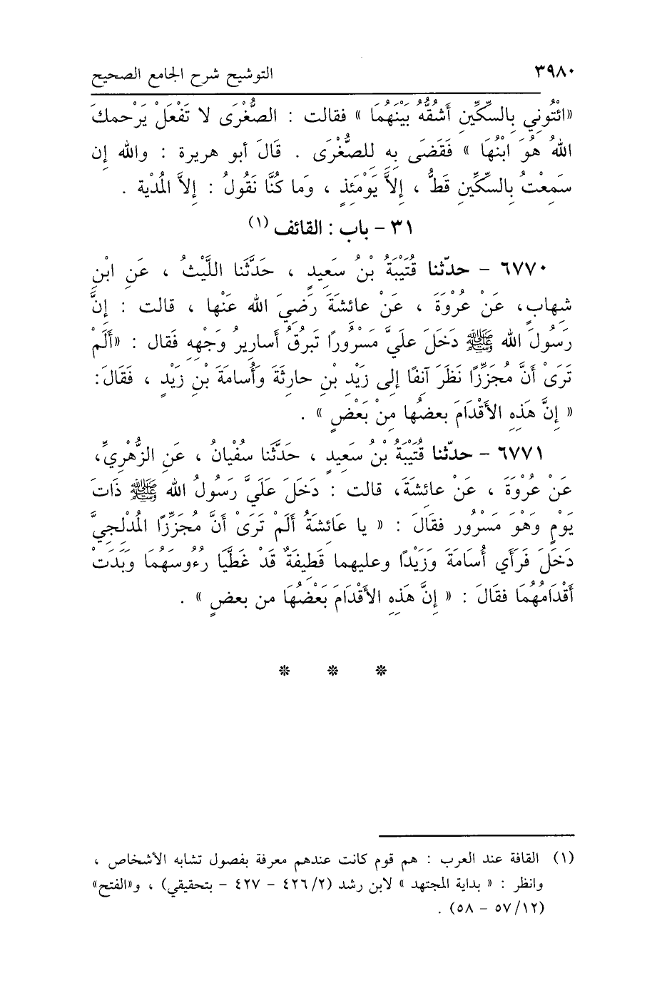 6771 - حَدَّثَنَا قُتَيْبَةُ بْنُ سَعِيدٍ، حَدَّثَنَا سُفْيَانُ، عَنِ الزُّهْرِيِّ، عَنْ عُرْوَةَ، عَنْ عَائِشَةَ، قَالَتْ: دَخَلَ عَلَيَّ رَسُولُ اللَّهِ صَلَّى اللهُ عَلَيْهِ وَسَلَّمَ ذَاتَ يَوْمٍ وَهُوَ مَسْرُورٌ، فَقَالَ: " يَا عَائِشَةُ، أَلَمْ تَرَيْ أَنَّ مُجَزِّزًا المُدْلِجِيَّ دَخَلَ عَلَيَّ فَرَأَى أُسَامَةَ بْنَ زَيْدٍ وَزَيْدًا وَعَلَيْهِمَا قَطِيفَةٌ، قَدْ غَطَّيَا رُءُوسَهُمَا وَبَدَتْ أَقْدَامُهُمَا، فَقَالَ: إِنَّ هَذِهِ الأَقْدَامَ بَعْضُهَا مِنْ بَعْضٍ"