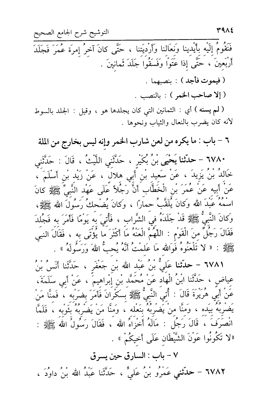 6781 - حَدَّثَنَا عَلِيُّ بْنُ عَبْدِ اللَّهِ بْنِ جَعْفَرٍ، حَدَّثَنَا أَنَسُ بْنُ عِيَاضٍ، حَدَّثَنَا ابْنُ الهَادِ، عَنْ مُحَمَّدِ بْنِ إِبْرَاهِيمَ، عَنْ أَبِي سَلَمَةَ، عَنْ أَبِي هُرَيْرَةَ، قَالَ: أُتِيَ النَّبِيُّ صَلَّى اللهُ عَلَيْهِ وَسَلَّمَ بِسَكْرَانَ، فَأَمَرَ بِضَرْبِهِ. فَمِنَّا مَنْ يَضْرِبُهُ بِيَدِهِ وَمِنَّا مَنْ يَضْرِبُهُ بِنَعْلِهِ وَمِنَّا مَنْ يَضْرِبُهُ بِثَوْبِهِ، فَلَمَّا انْصَرَفَ قَالَ رَجُلٌ: مَا لَهُ أَخْزَاهُ اللَّهُ، فَقَالَ رَسُولُ اللَّهِ صَلَّى اللهُ عَلَيْهِ وَسَلَّمَ: «لاَ تَكُونُوا عَوْنَ الشَّيْطَانِ عَلَى أَخِيكُمْ».