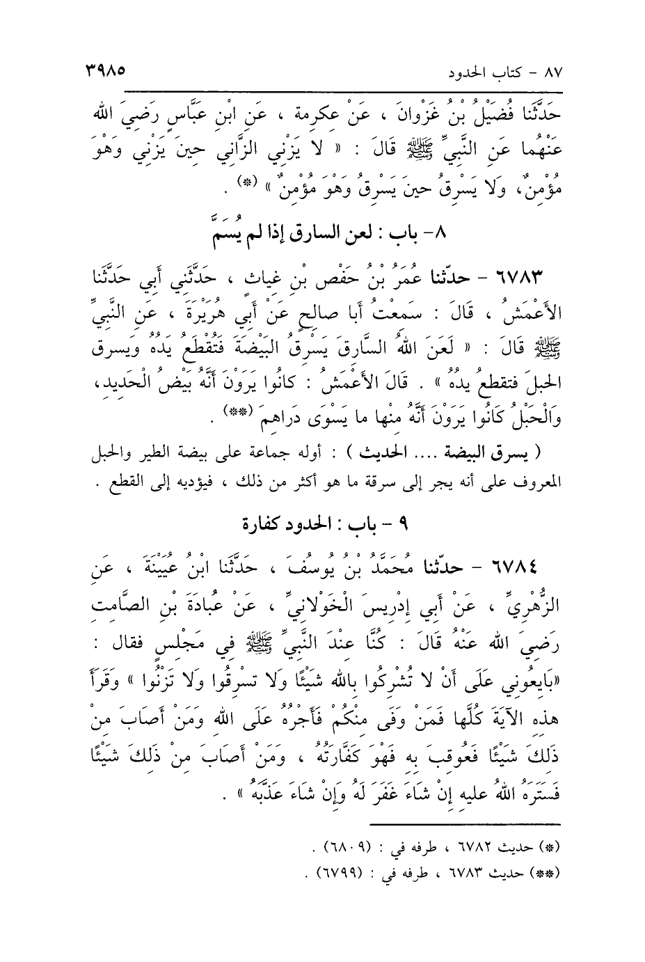 6783 - حَدَّثَنَا عُمَرُ بْنُ حَفْصِ بْنِ غِيَاثٍ، حَدَّثَنِي أَبِي، حَدَّثَنَا الأَعْمَشُ، قَالَ: سَمِعْتُ أَبَا صَالِحٍ، عَنْ أَبِي هُرَيْرَةَ، عَنِ النَّبِيِّ صَلَّى اللهُ عَلَيْهِ وَسَلَّمَ، قَالَ: «لَعَنَ اللَّهُ السَّارِقَ، يَسْرِقُ البَيْضَةَ فَتُقْطَعُ يَدُهُ، وَيَسْرِقُ الحَبْلَ فَتُقْطَعُ يَدُهُ» قَالَ الأَعْمَشُ: «كَانُوا يَرَوْنَ أَنَّهُ بَيْضُ الحَدِيدِ، وَالحَبْلُ كَانُوا يَرَوْنَ أَنَّهُ مِنْهَا مَا يَسْوَى دَرَاهِمَ».
