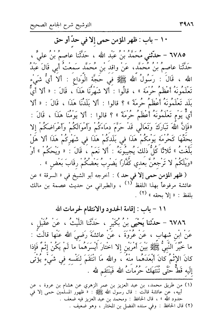 (ظهر المؤمن حمى إلا في حد): أخرجه أبو الشيخ في "السرقة" عن عائشة مرفوعًا بهذا اللفظ، والطبراني من حديث عصمة بن مالك بلفظ: "إلا بحقه".