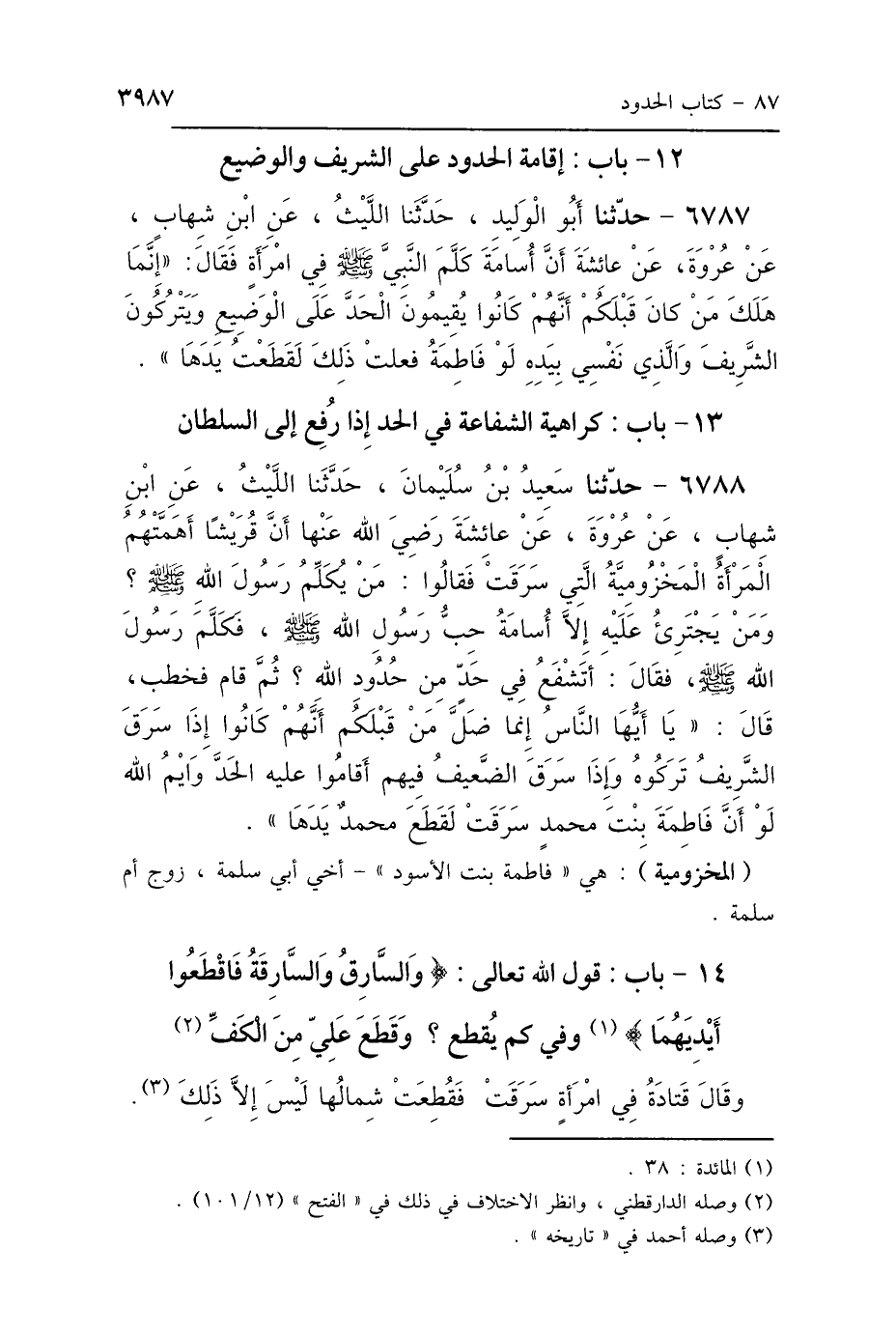 6788 - حَدَّثَنَا سَعِيدُ بْنُ سُلَيْمَانَ، حَدَّثَنَا اللَّيْثُ، عَنِ ابْنِ شِهَابٍ، عَنْ عُرْوَةَ، عَنْ عَائِشَةَ، رَضِيَ اللَّهُ عَنْهَا: أَنَّ قُرَيْشًا أَهَمَّتْهُمُ المَرْأَةُ المَخْزُومِيَّةُ الَّتِي سَرَقَتْ، فَقَالُوا: مَنْ يُكَلِّمُ رَسُولَ اللَّهِ صَلَّى اللهُ عَلَيْهِ وَسَلَّمَ، وَمَنْ يَجْتَرِئُ عَلَيْهِ إِلَّا أُسَامَةُ بْنُ زَيْدٍ، حِبُّ رَسُولِ اللَّهِ صَلَّى اللهُ عَلَيْهِ وَسَلَّمَ، فَكَلَّمَ رَسُولَ اللَّهِ صَلَّى اللهُ عَلَيْهِ وَسَلَّمَ، فَقَالَ: «أَتَشْفَعُ فِي حَدٍّ مِنْ حُدُودِ اللَّهِ» ثُمَّ قَامَ فَخَطَبَ، قَالَ: «يَا أَيُّهَا النَّاسُ، إِنَّمَا ضَلَّ مَنْ قَبْلَكُمْ، أَنَّهُمْ كَانُوا إِذَا سَرَقَ الشَّرِيفُ تَرَكُوهُ، وَإِذَا سَرَقَ الضَّعِيفُ فِيهِمْ أَقَامُوا عَلَيْهِ الحَدَّ، وَايْمُ اللَّهِ، لَوْ أَنَّ فَاطِمَةَ بِنْتَ مُحَمَّدٍ صَلَّى اللهُ عَلَيْهِ وَسَلَّمَ، سَرَقَتْ لَقَطَعَ مُحَمَّدٌ يَدَهَا».