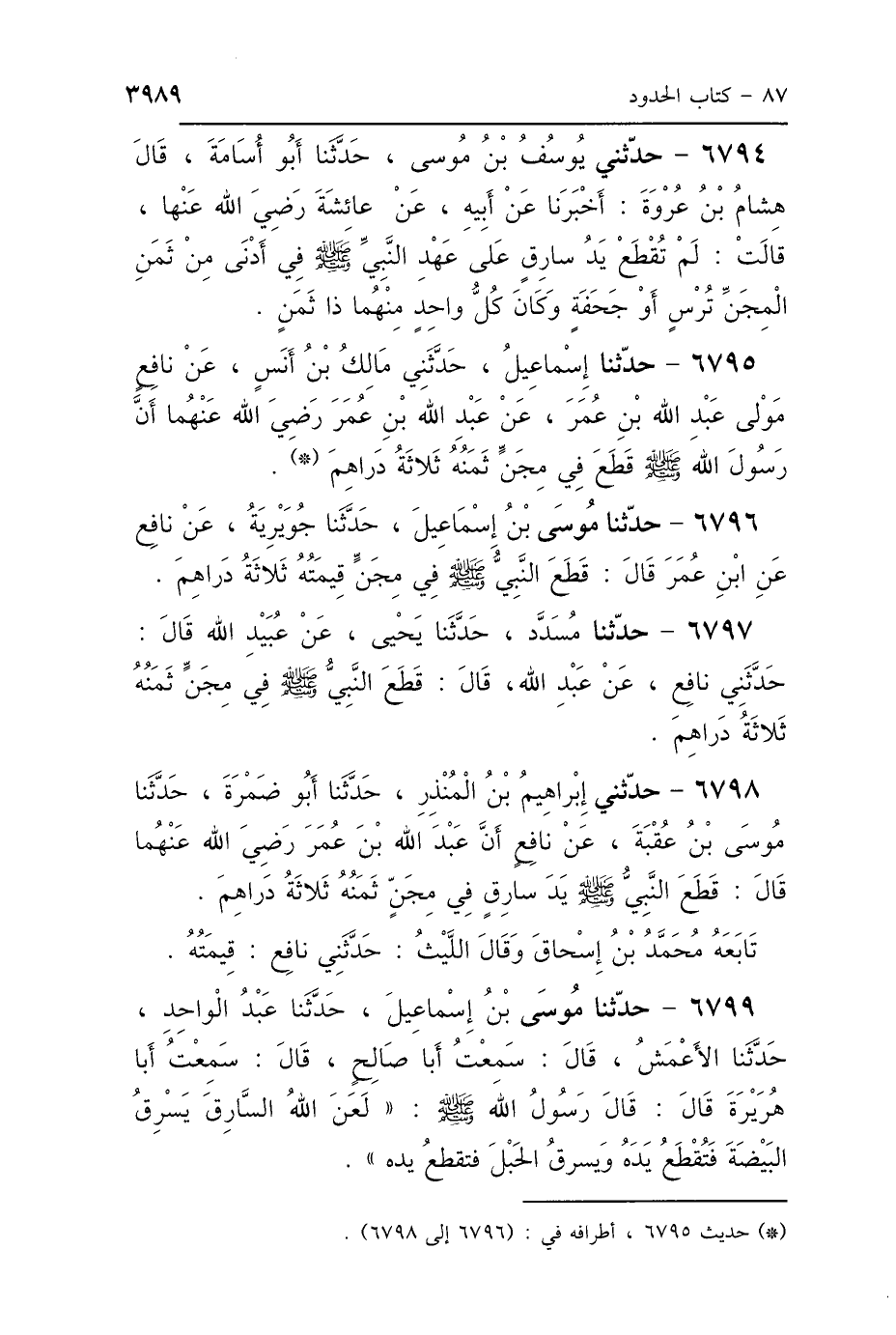 6798 - حَدَّثَنِي إِبْرَاهِيمُ بْنُ المُنْذِرِ، حَدَّثَنَا أَبُو ضَمْرَةَ، حَدَّثَنَا مُوسَى بْنُ عُقْبَةَ، عَنْ نَافِعٍ، أَنَّ عَبْدَ اللَّهِ بْنَ عُمَرَ رَضِيَ اللَّهُ عَنْهُمَا، قَالَ: «قَطَعَ النَّبِيُّ صَلَّى اللهُ عَلَيْهِ وَسَلَّمَ يَدَ سَارِقٍ فِي مِجَنٍّ ثَمَنُهُ ثَلاَثَةُ دَرَاهِمَ» تَابَعَهُ مُحَمَّدُ بْنُ إِسْحَاقَ، وَقَالَ اللَّيْثُ: حَدَّثَنِي نَافِعٌ قِيمَتُهُ.